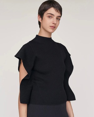 タイトフィットなモックネックのスリーブレストップ。左右の美しいドレープが特徴で、着用するとフレンチスリーブのように見えます。コンピュータープログラミングによって設計されたリブのラインがシャープな印象で、光沢感のあるキュプラとポリエステル糸を用いているため程よい張り感を与えてくれます。縫代がなく、ストレッチ性に優れ、快適な着心地です。