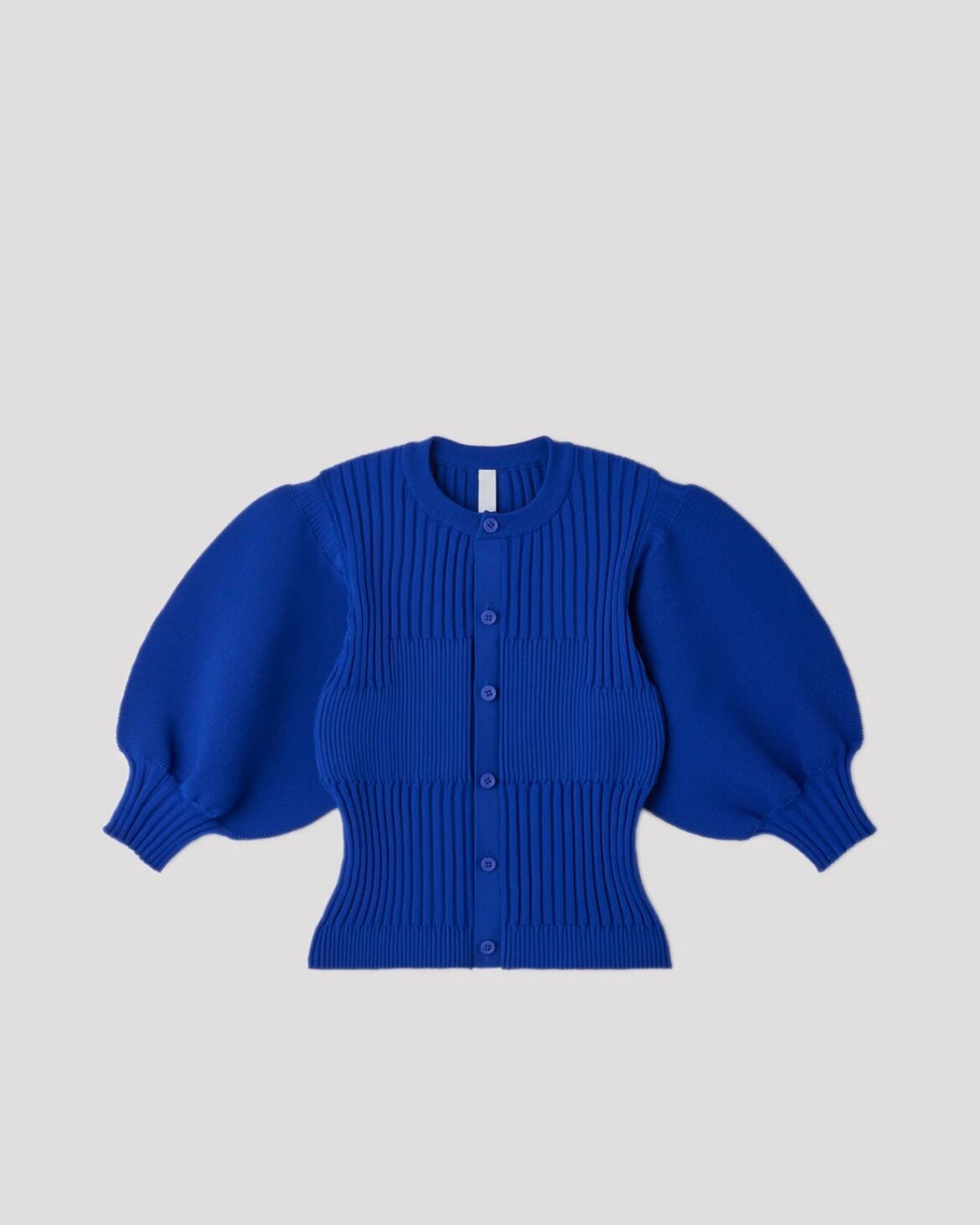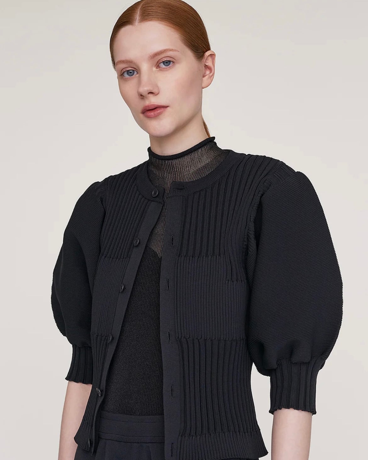 CFCLを象徴するFLUTEDシリーズのパフスリーブ カーディガン。ストレッチ性の異なる2種類のリブを交互に編むことでユニークなシルエットを生み出しています。パフスリーブの丸みは、袖口の高さを調整することでボリュームの印象を変えてお楽しみいただけます。