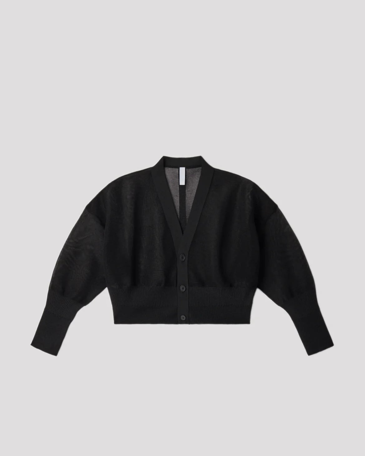 ソリッドであらゆるスタイルにフィットするクロップドカーディガン。全面に透け感のある糸を用いた編み地が軽やかでエレガントな印象を与えます。ゆったりとしたアームホールと、ウエストラインの幅が広いリブによって作られるバルーンシルエットが特徴です。二段階のリブデザインを施した袖口と裾が洗練された雰囲気を演出します。
