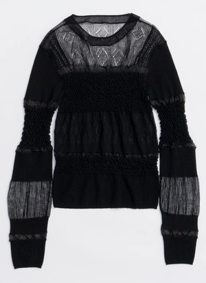 ・立体感のあるスモッキングと、透け感のある糸で様々な編地をミックスさせたニット。
