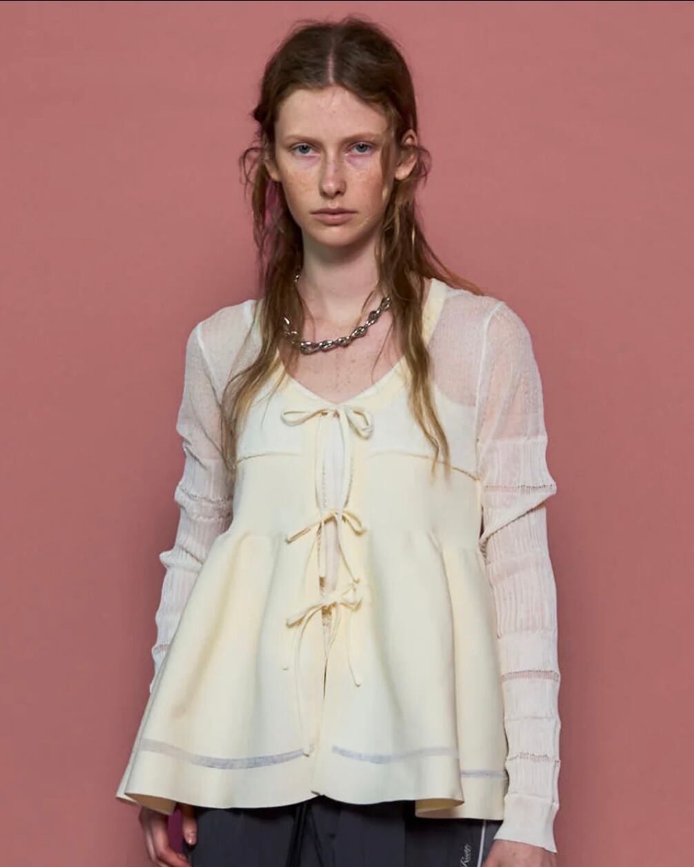 ・立体感のあるスモッキングと、透け感のある糸で様々な編地をミックスさせたニット。