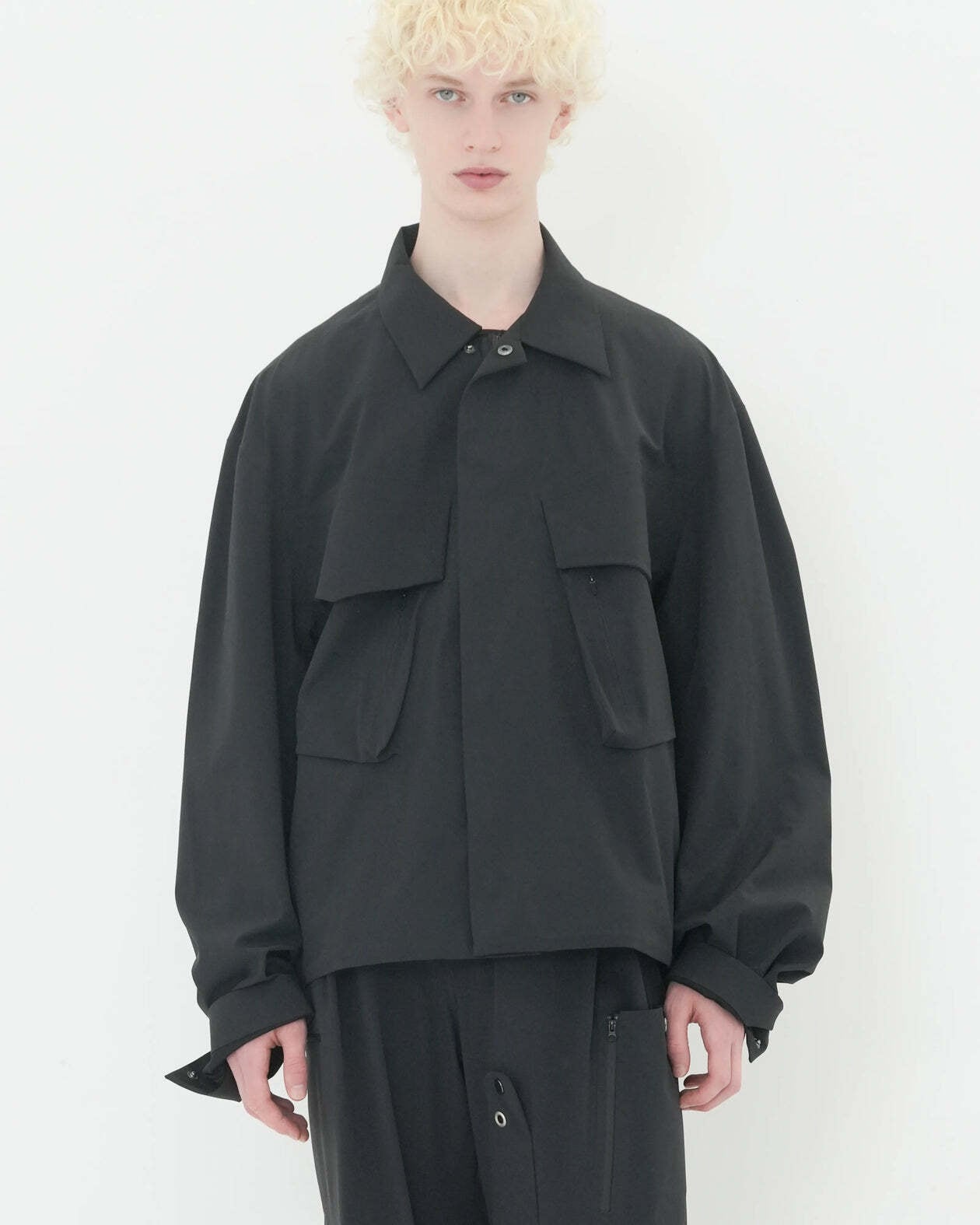 シャツとジャケットの中間に位置するアイテムで、前身頃はシャツ襟とボタン開閉を保持しつつ、胸に配置した両開きポケットはジャケット風の構造的アクセントになっています。肩の切り替えとドロップショルダーによりゆったりとしたリラックス感のあるシルエットを実現。細部にはジップ付きやフラップ付きポケット、コードやテープディテールを用いた装飾を配置し、着る人の動きやスタイリングに応じて表情を変化させる構成美が魅力です。