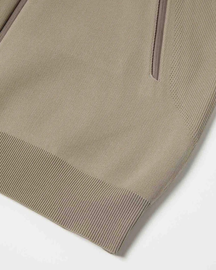 ニットソーの製法を応用し、ウルトラソニック加工(超音波溶着加工)と熱接着加工との併用でシームレスデザインを実現した、運動性と快適性を両立したアイテム。