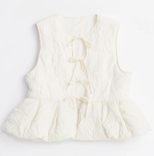 ・立体感のあるジャガード素材の身頃に、オリジナルの手書き風刺繍を施したペプラムが華やかなアクセントになったパッファーベスト。