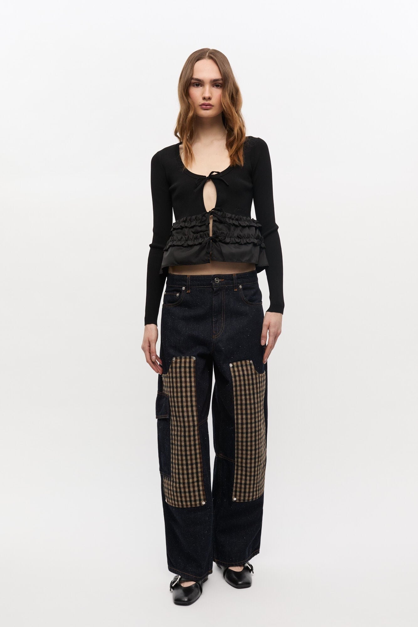 リブ編みのニットテクスチャ、タイフロントクロージャー、コントラストのある生地のフリル裾ディテールが特徴です。