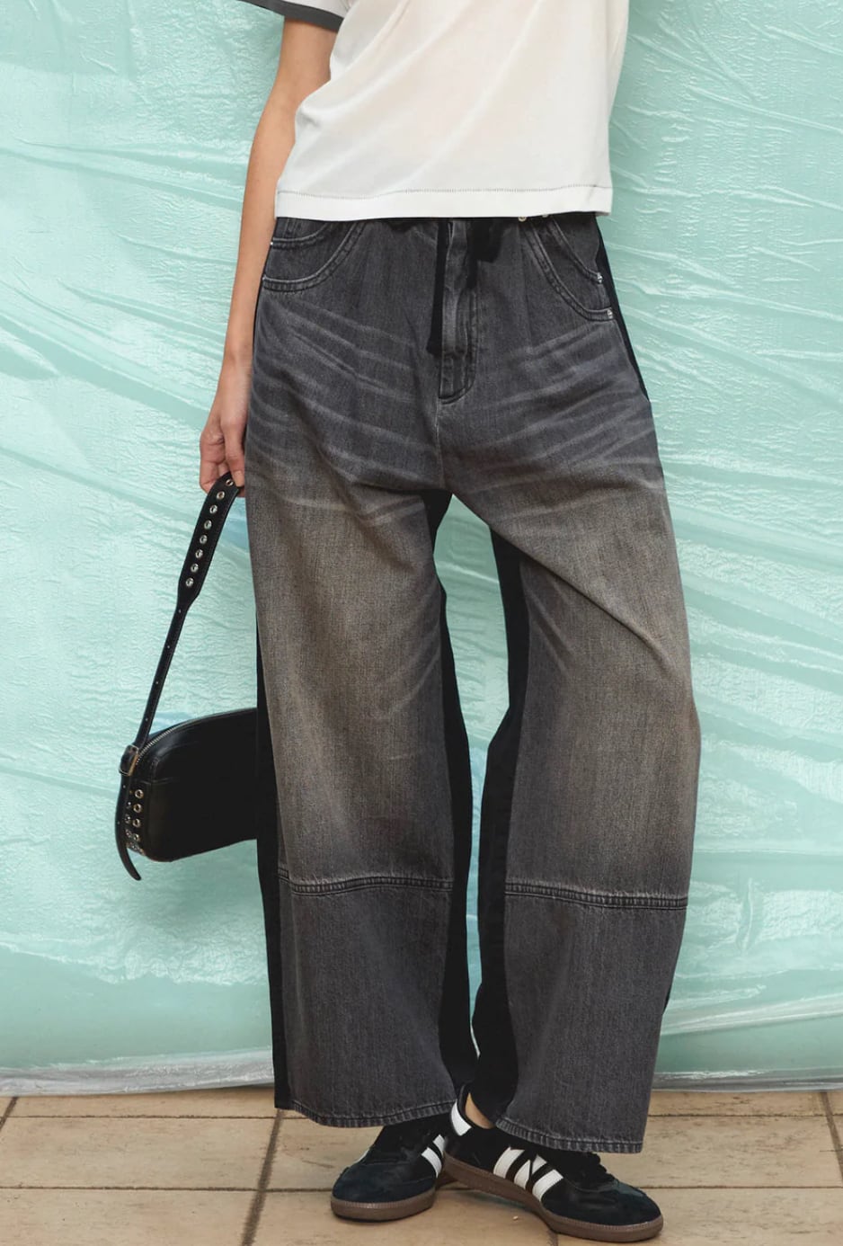 デニムとカットソーがドッキングされたリラックスパンツ。