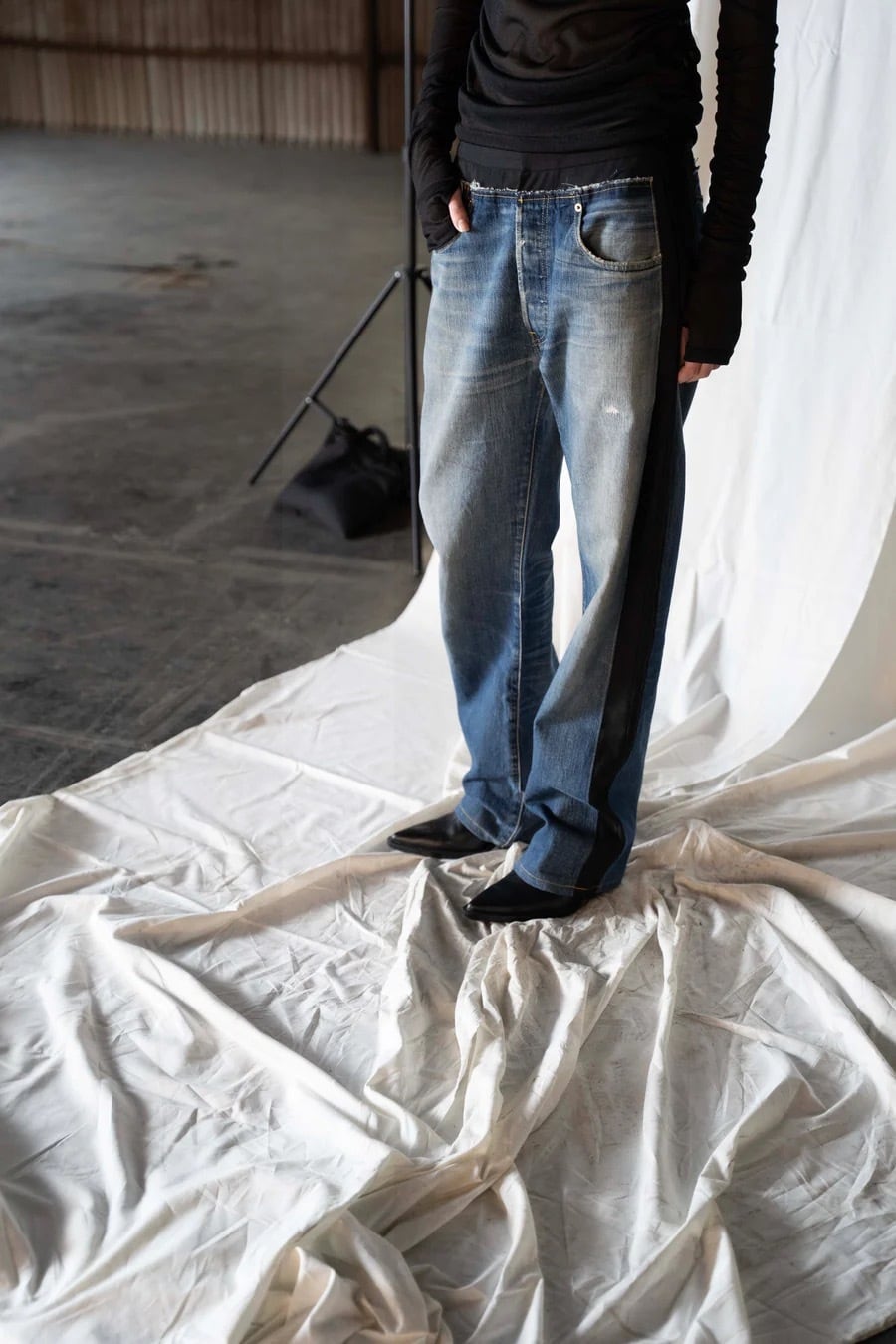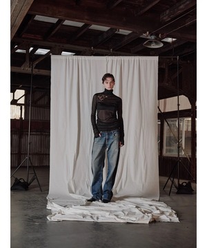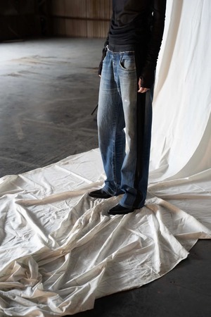 分断された衣服のパーツ、デニムは「リーバイス(LEVI’S)」のジーンズ“501” と身頃のベースはテーラードパンツから、既存の断片を組み合わせて新たな形を生み出す手法で再構築しています。