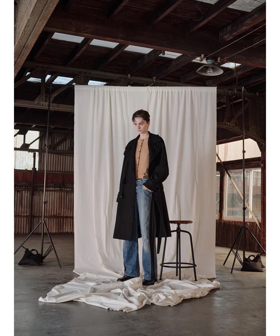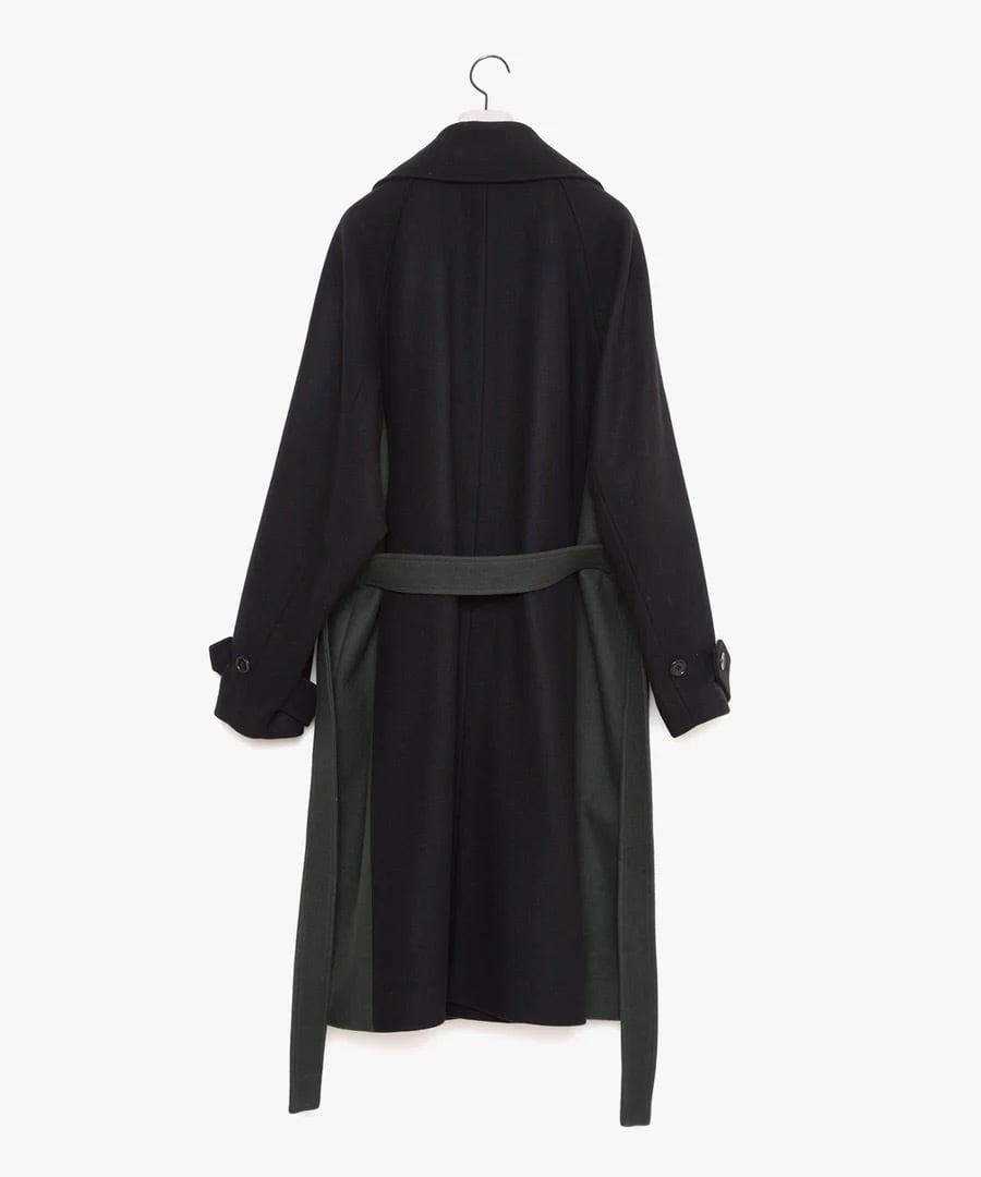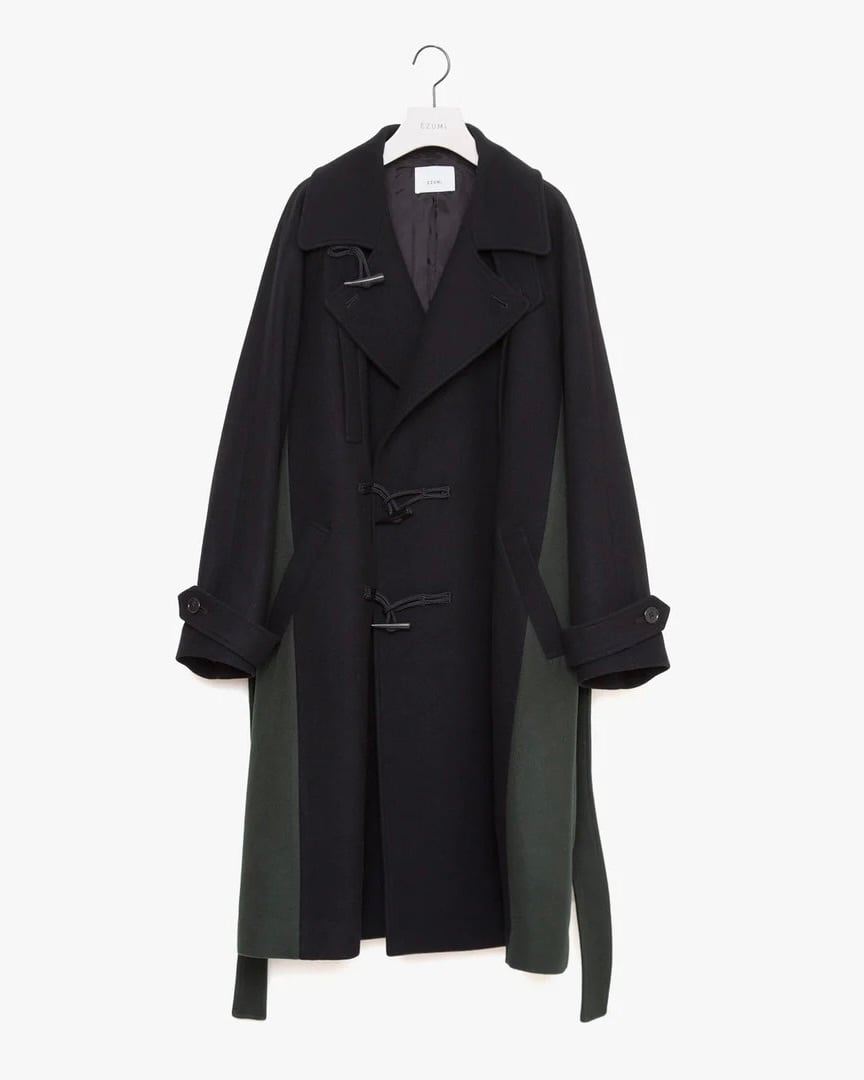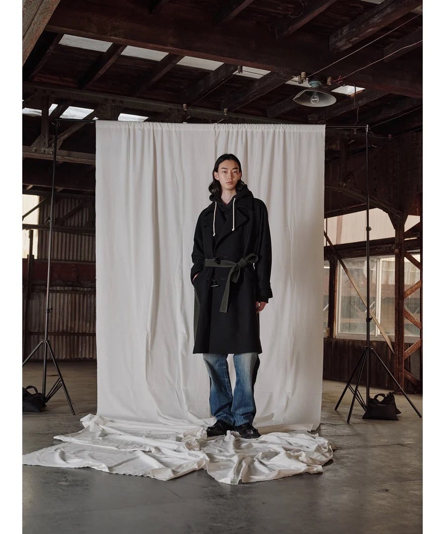 「現代は、未来から見た過去である」という視点のもと、現代の衣服が未来で発掘されるという架空の考古学的アプローチに基づき、デザインを展開しています。 分断された衣服の要素、伝統的なトグル留めをダッフルコートと身頃のディティールはPコートから、既存の断片を組み合わせて新たな形を生み出す手法で再構築しています。脇パネルの配色が視覚的アクセントを生み出し、洗練された現代的アイデンティティを表現しています。 膨らみ感、柔らかさ、上質な風合いが特徴のメルトン素材を使用し、保温性と快適さを兼ね備えています。