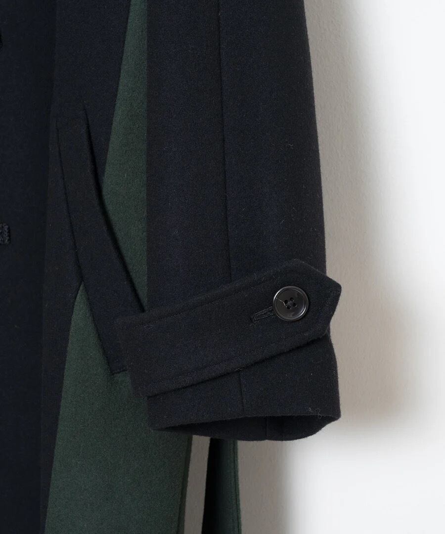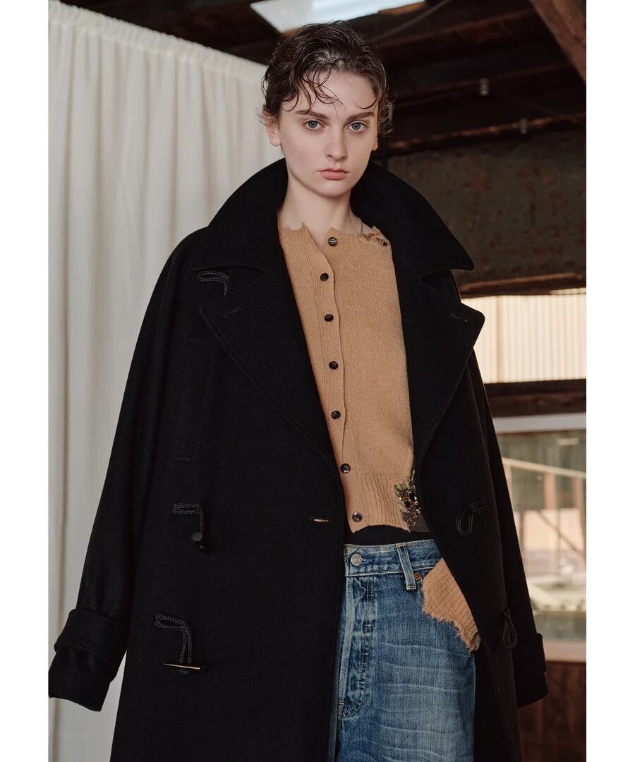 クラシックなダッフルコートとピーコートをブリコラージュしたウールメルトンコートです。