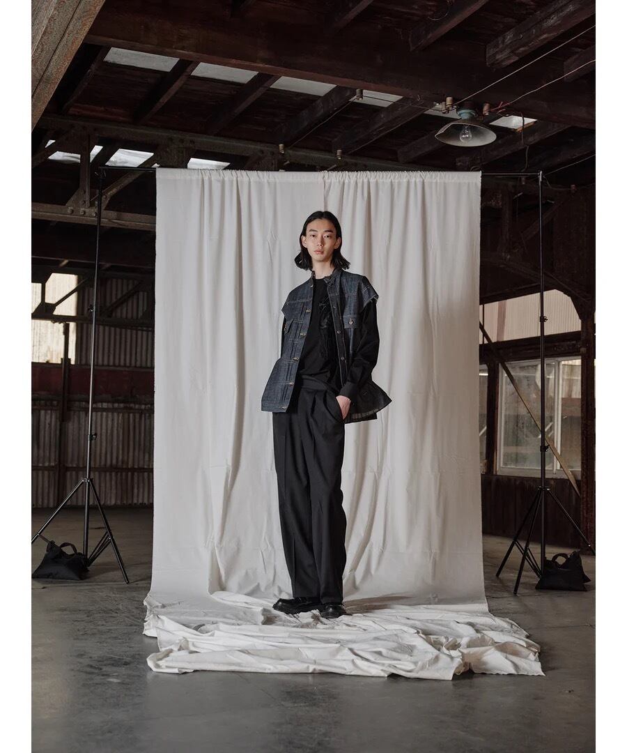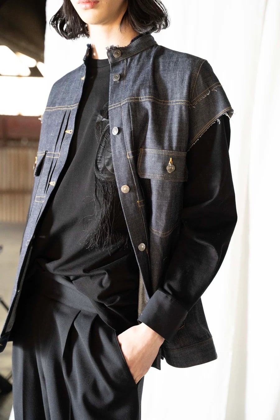 分断された衣服の要素、デニムジャケットにバックプリーツを施すことで、既存の断片を組み合わせて新たな形を生み出す手法で再構築しています。