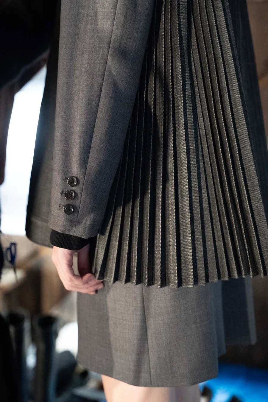 分断された衣服の要素、デニムジャケットにバックプリーツを施すことで、既存の断片を組み合わせて新たな形を生み出す手法で再構築しています。