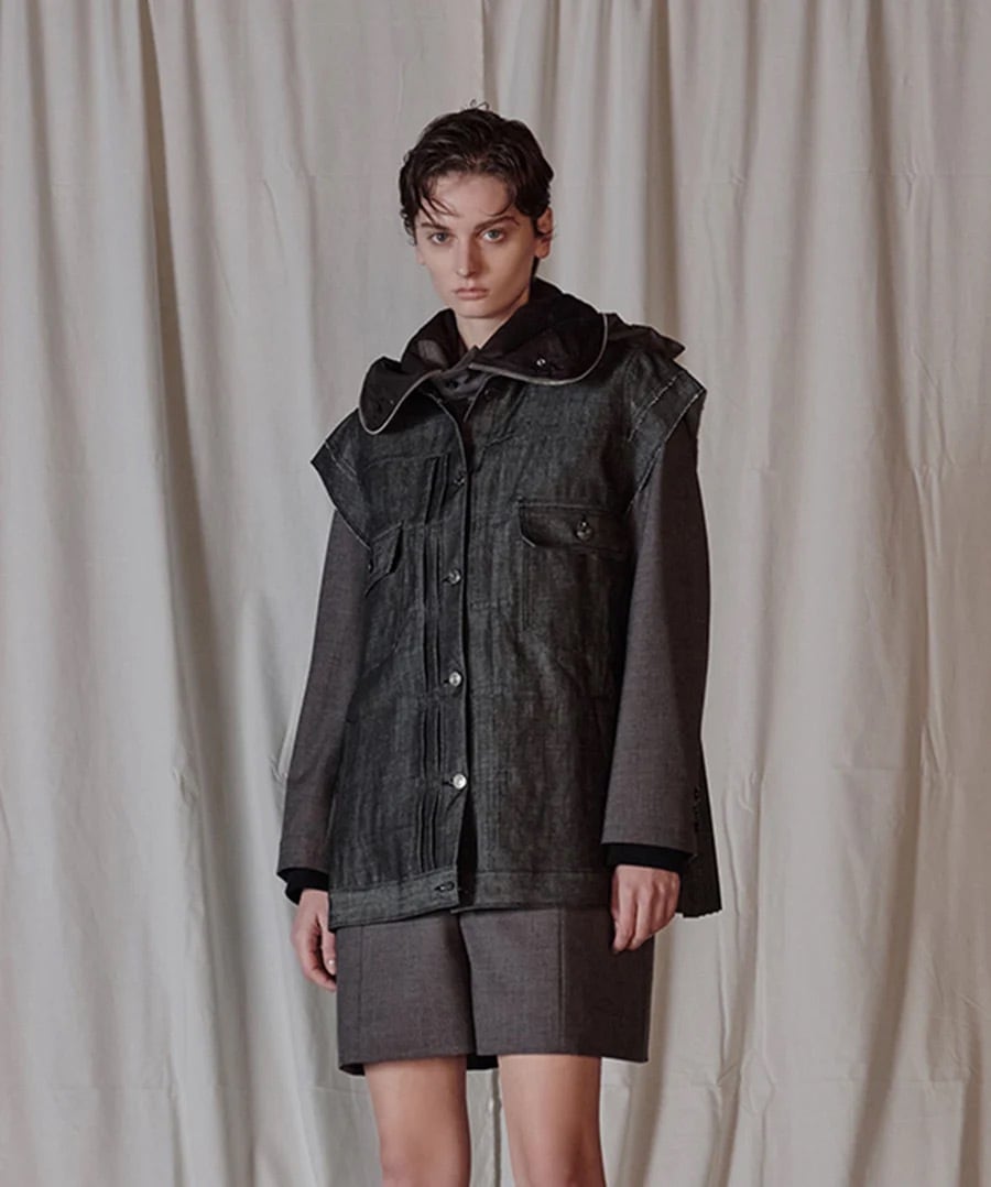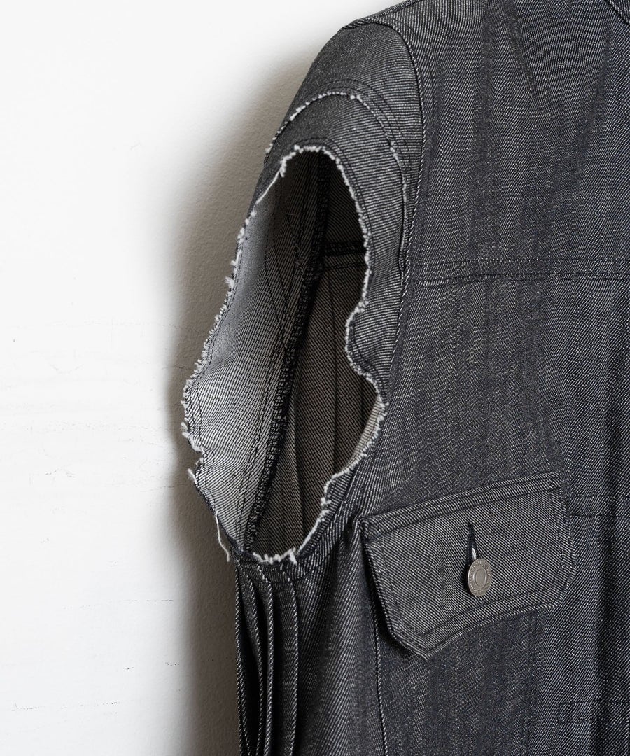 フロントはシンプルながら、背面に施された大胆なプリーツデザインが特徴のデニムジレ。