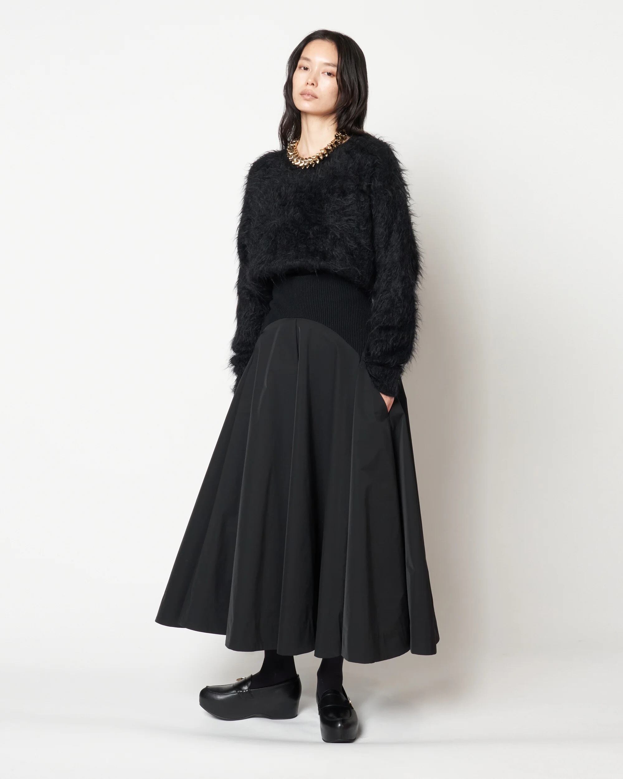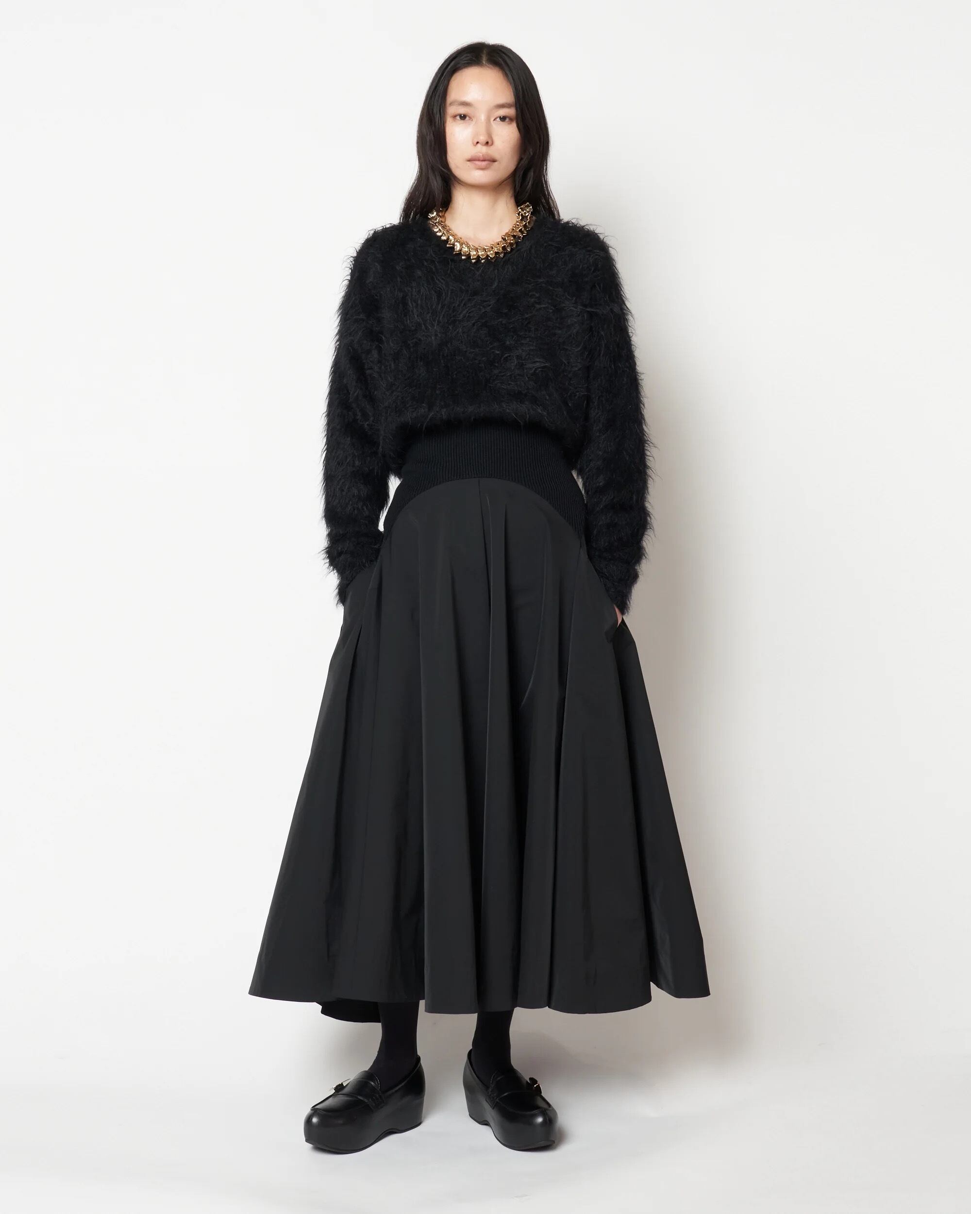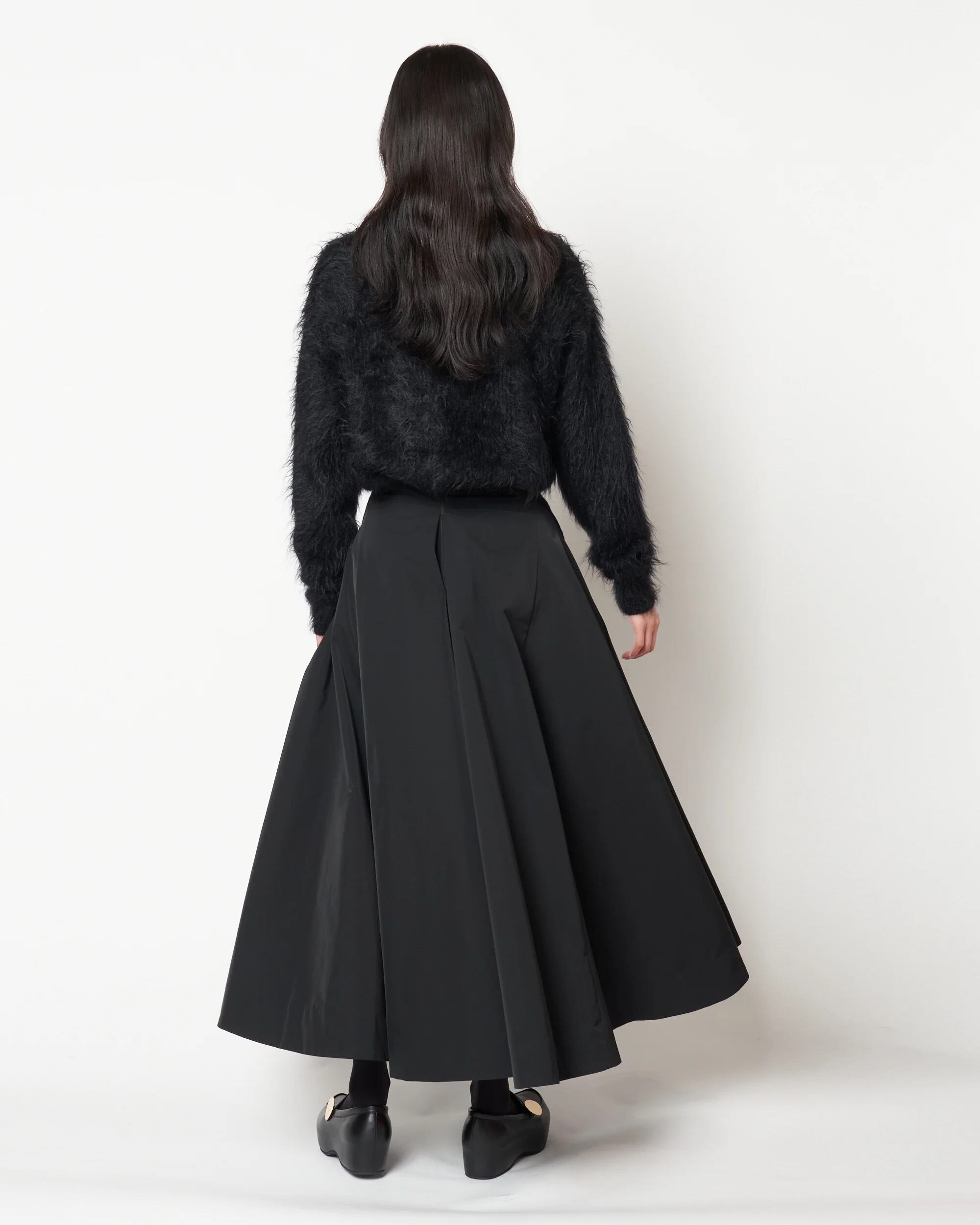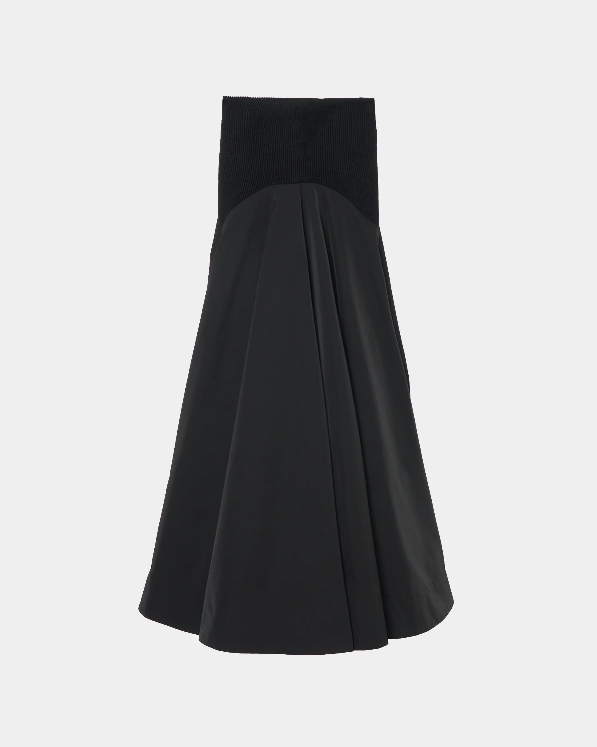 HARUNOBUMURATA 秋冬新作コレクションより、ウエストのリブがもたらす快適な着心地と、軽やかなポリエステル素材が滑らかに揺れる、フレアラインのハイウエストスカート。