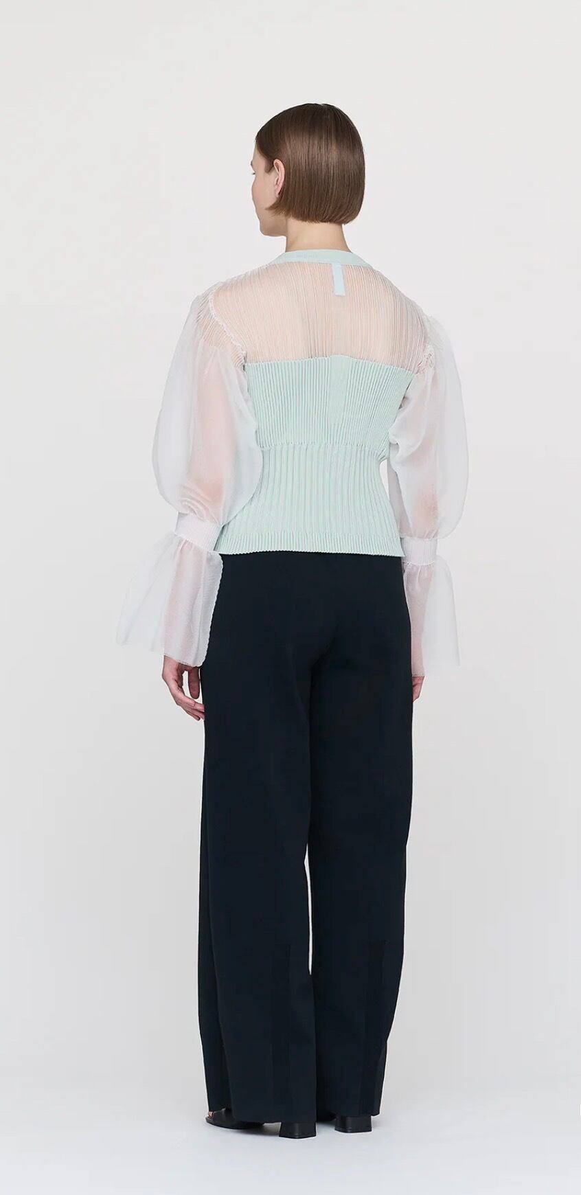 CFCLを象徴するFLUTEDシリーズのトップ。ストレッチ性の異なる2種類のリブを交互に編むことでユニークなシルエットを生み出しています。透け感のある糸で編まれたパフスリーブの柔らかな丸みが、軽やかで洗練された印象を与えます。