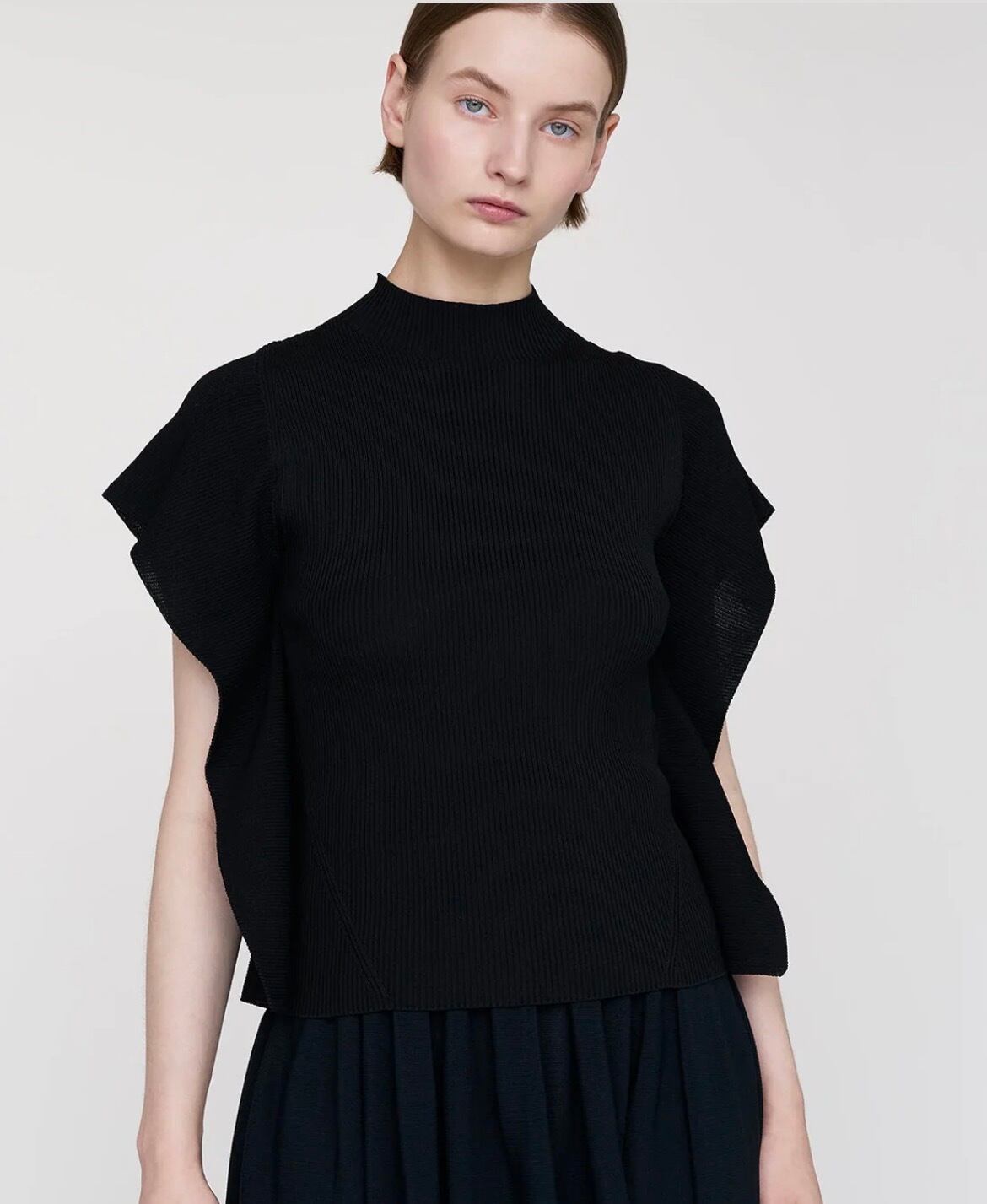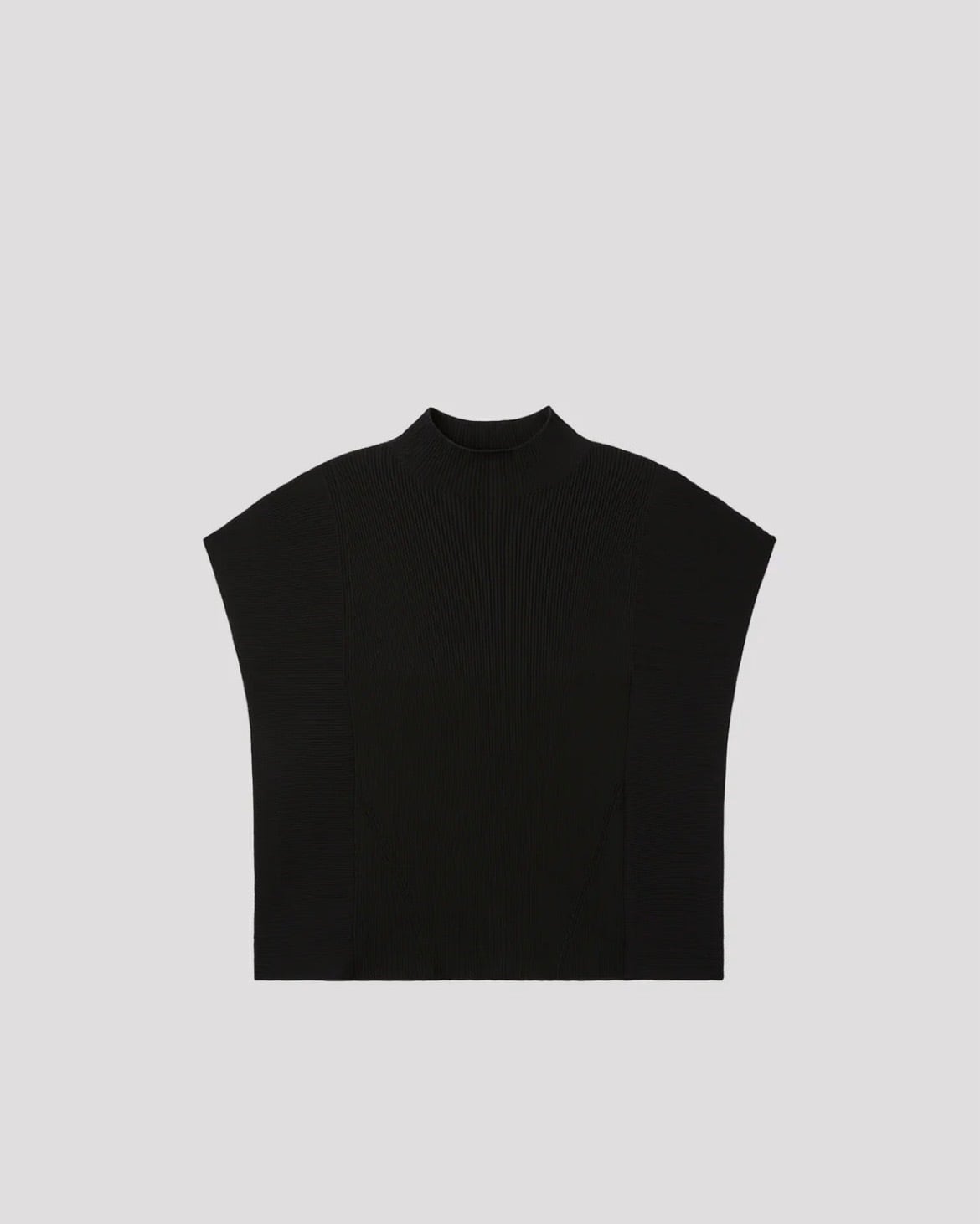タイトフィットなモックネックのスリーブレストップ。左右の美しいドレープが特徴で、着用するとフレンチスリーブのように見えます。コンピュータープログラミングによって設計されたリブのラインがシャープな印象で、光沢感のあるキュプラとポリエステル糸を用いているため程よい張り感を与えてくれます。縫代がなく、ストレッチ性に優れ、快適な着心地です。