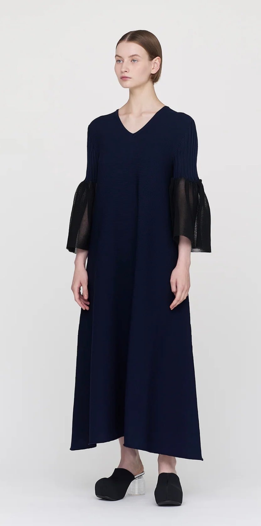 CFCLを象徴するPOTTERYシリーズのベルスリーブフレアドレス。コンピュータープログラミングによって作られた立体感のあるベルスリーブが特徴で、あらゆるオケージョンに対応できるデザインです。袖口には透明感のある糸を使用し、軽やかさを演出しています。縫代がなく、ストレッチ性に優れ、快適な着心地です。