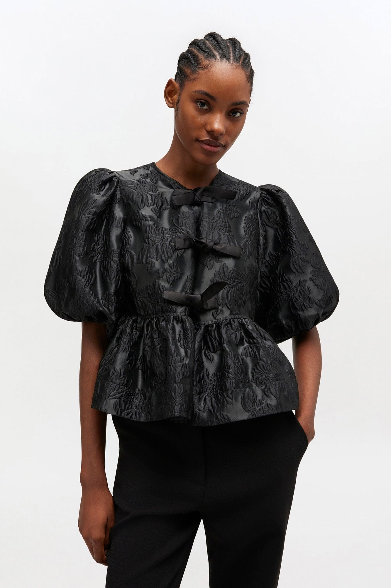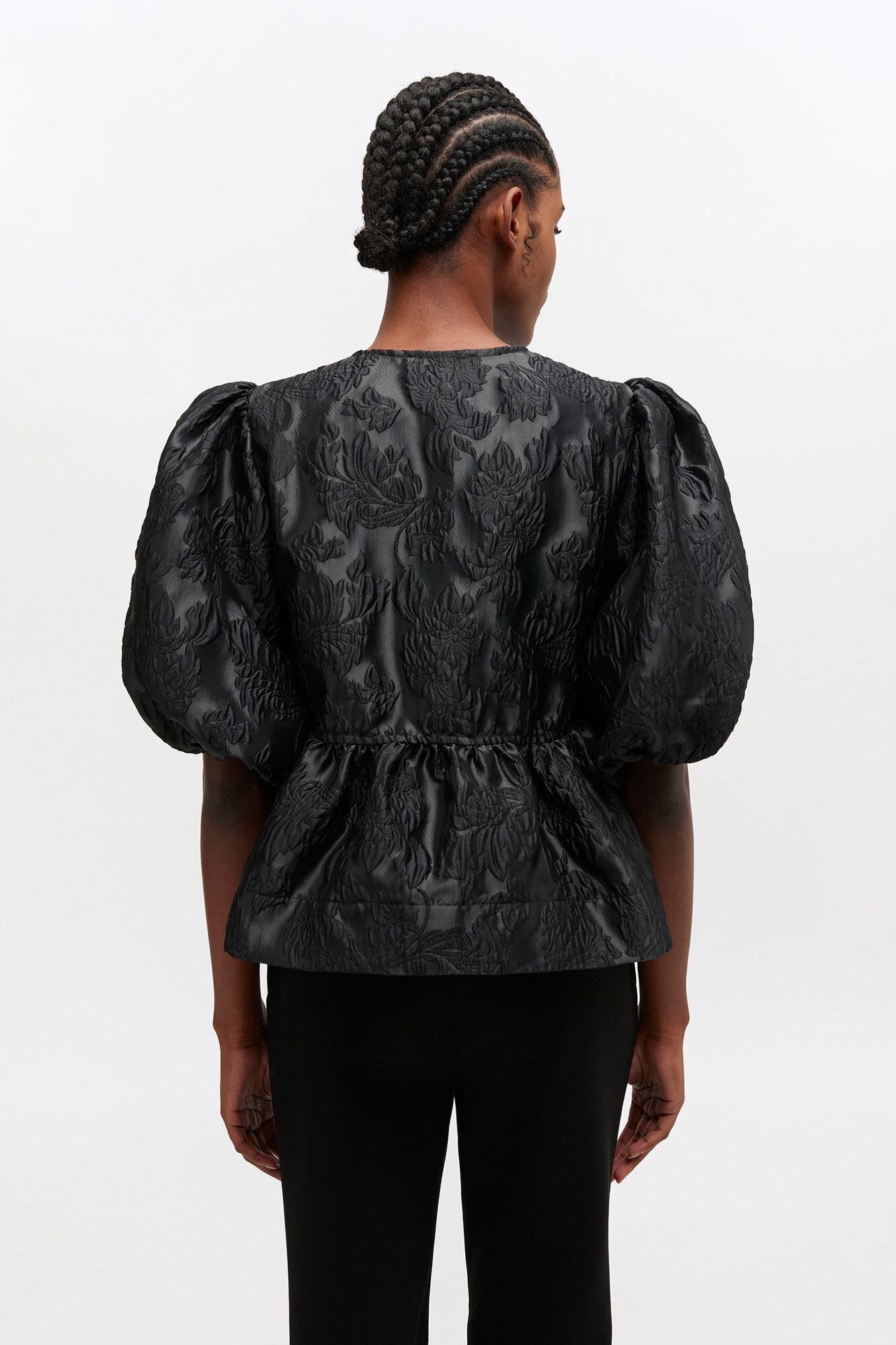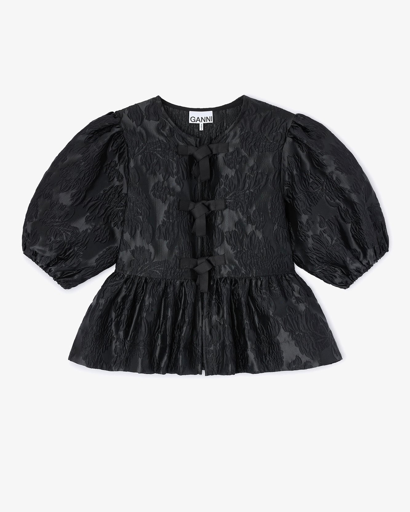 タイバンド付きのオープンなラウンドネックライン、エラスティックエッジのパフスリーブ、ペプラムヘムが特徴のブラウスです。
