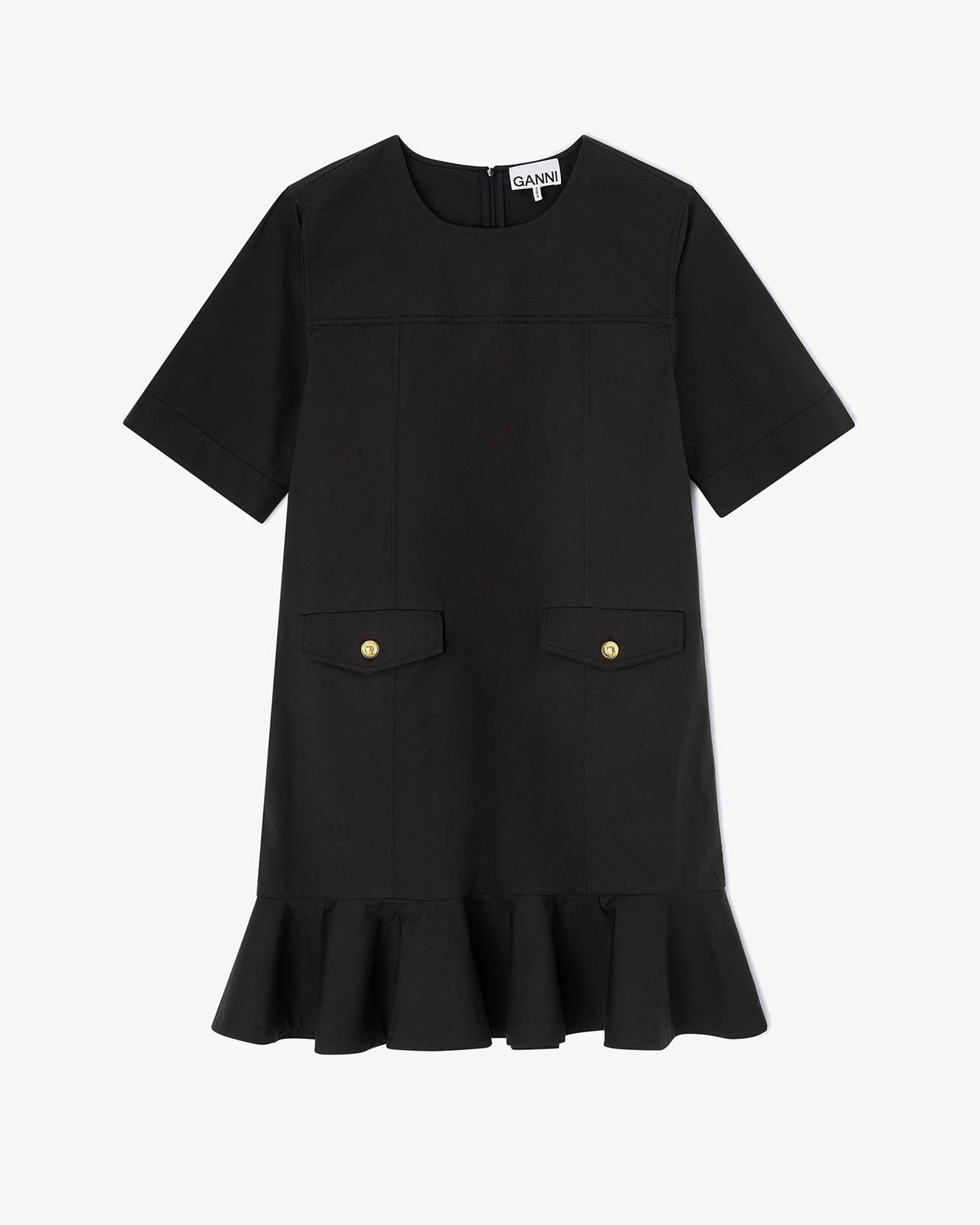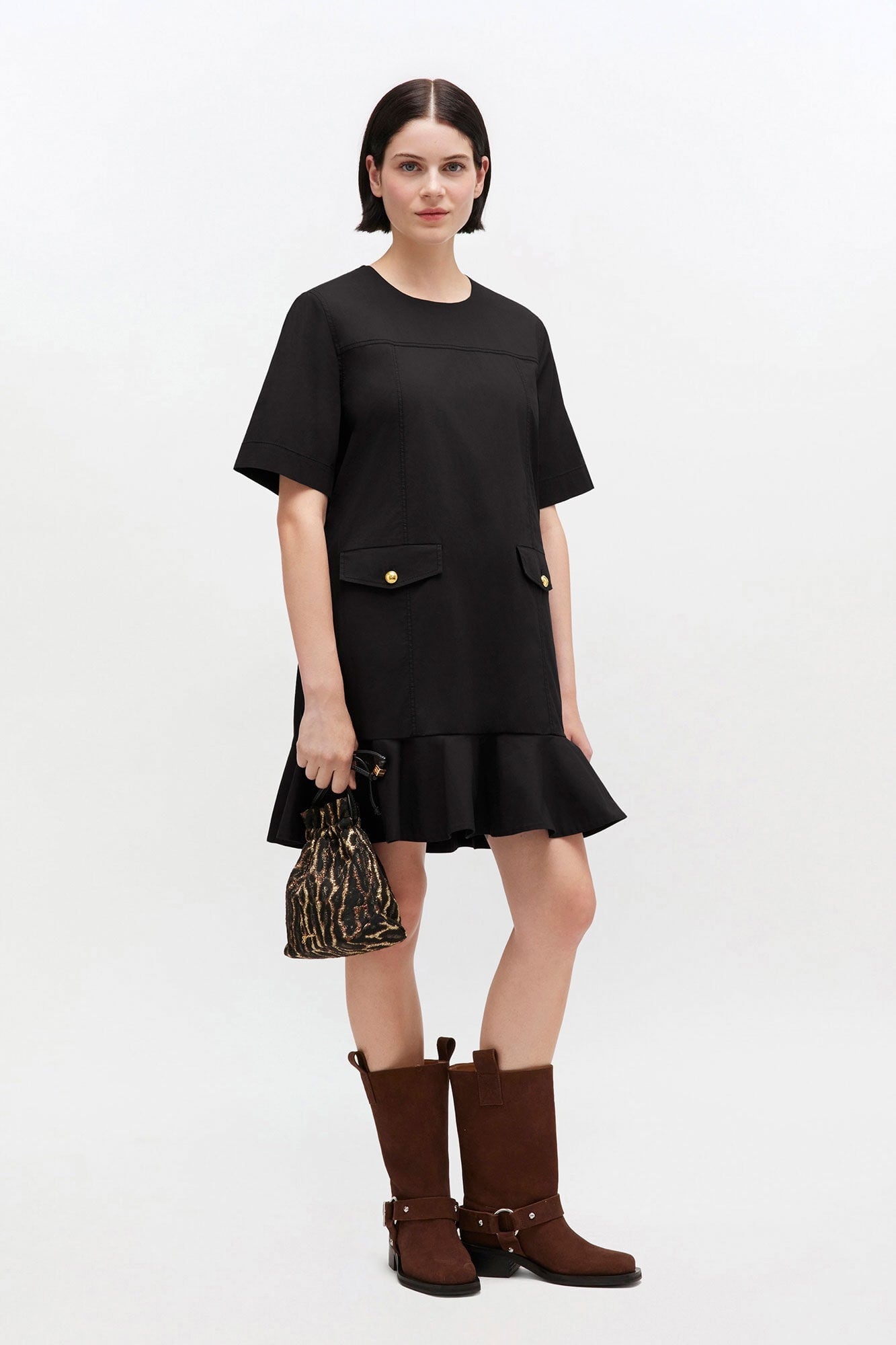 ラウンドネック、ポケット、ラッフルヘムディテールに加え、背面にはジッパークロージャーを備えたドレスです。
