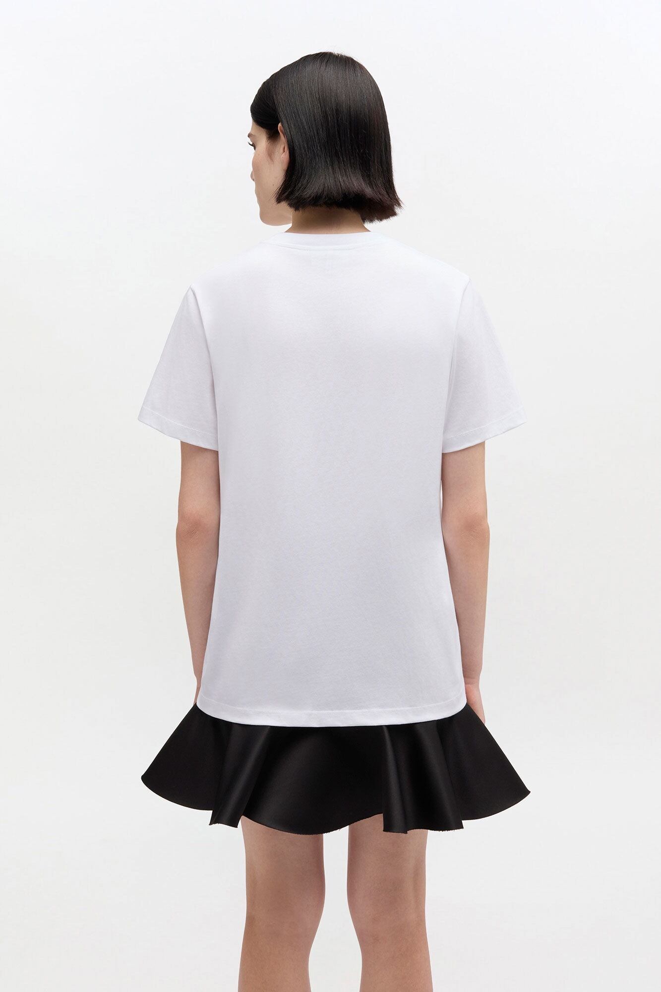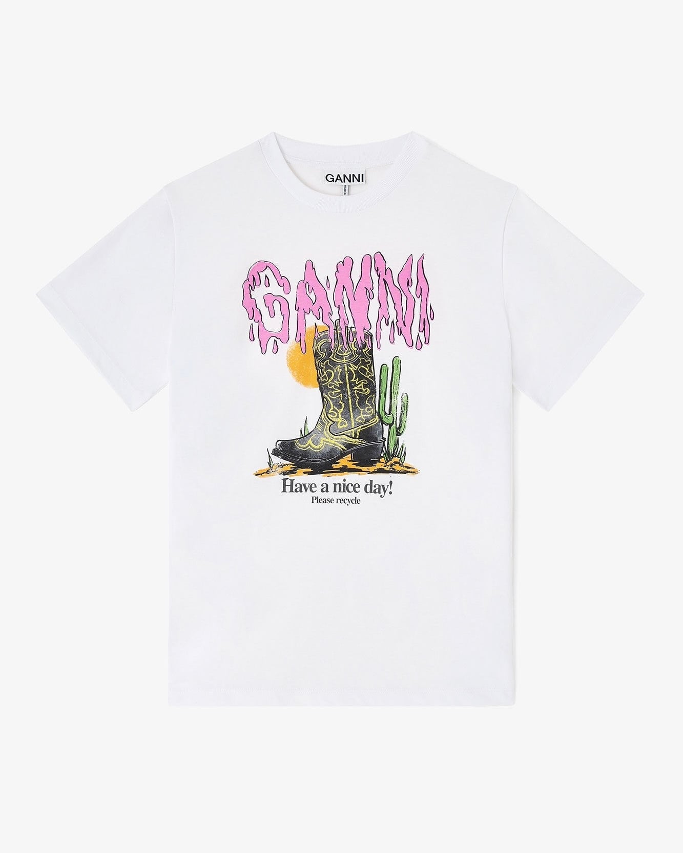このTシャツは、ラウンドネックラインとショートスリーブに、GANNIロゴをあしらったデザイン。ウェスタンブーツのプリントグラフィックと、「Have a nice day! Please recycle」メッセージがポイントです。