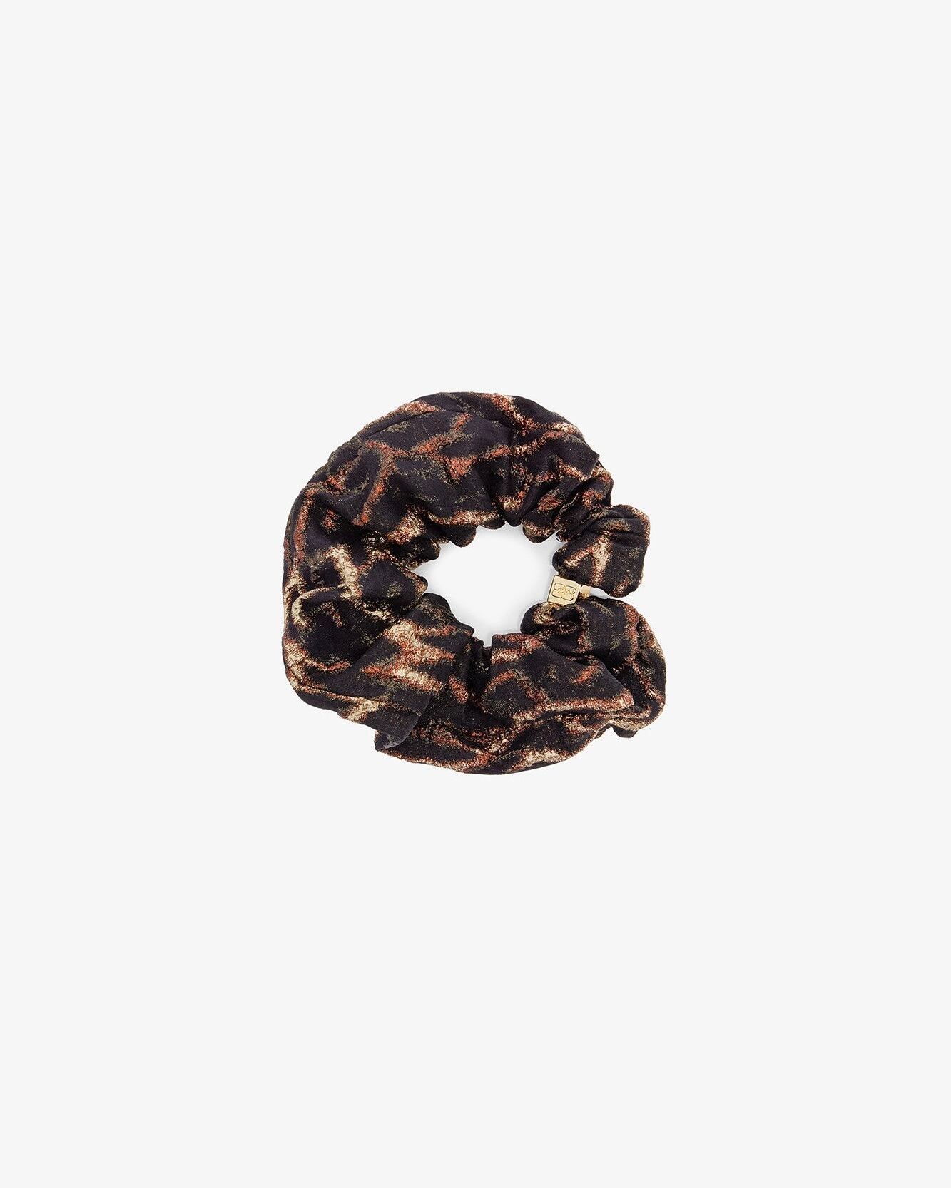 このシュシュはメタリックプリントをあしらい、GANNI Butterflyロゴを刻印したメタリックダイスが付いています。