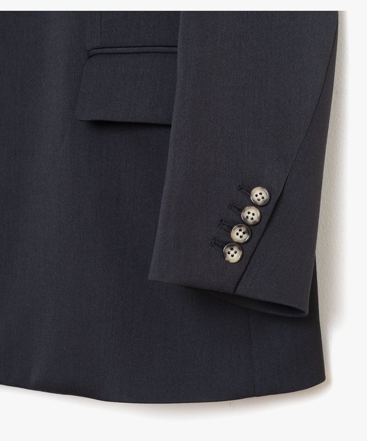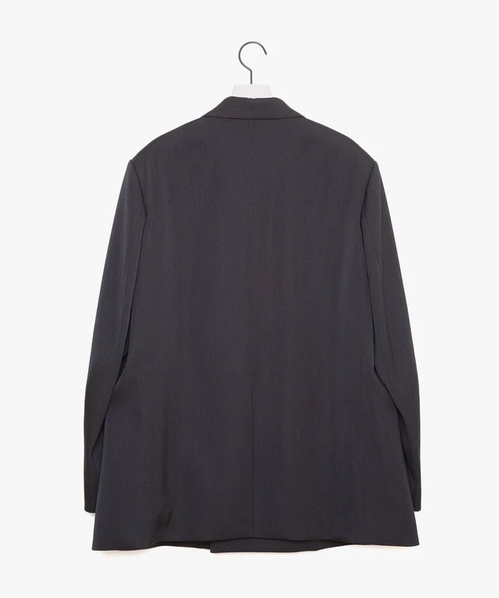 フロントはクラシックなダブルブレスト、ラペルはピークドラペルを採用。左右対称に配置されたフラップポケットと、削ぎ落とされたディテール群が、ジャケットというプロダクトを限りなく抽象的な造形へと導いています。