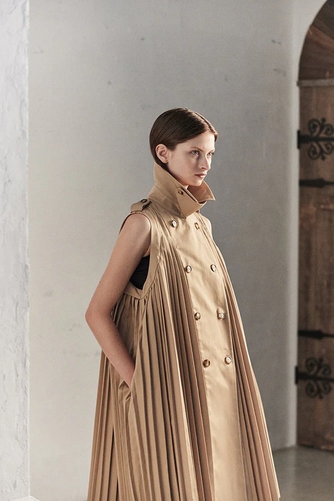 クラシックなトレンチコートの要素を踏襲しながら、袖を排し、プリーツによって再構築されたこの一着は、今季のテーマ「Sculpting the Void ― 余白を彫刻する」において象徴的な存在です。
