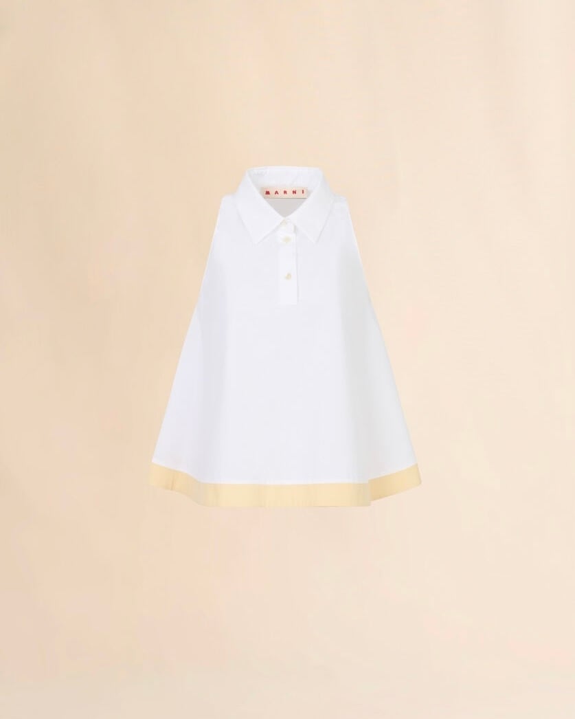 オーガニックコットンポプリン製ノースリーブトップス。 ポロ襟とボタン前立てのAラインシルエット。 コントラストの効いた裾のディテール。 首の後ろにMarni Wavesロゴ刺繍入り。 Made in Italy