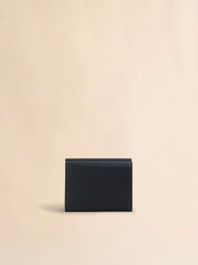 サフィアーノレザー製三つ折り財布。スナップボタン留めのモノクロームデザイン。外側にスナップボタン付きコインポケット。内側にフラットポケット1つとカードスロット1つ。ゴールドトーンの金具。フロントにゴールドで刻印されたロゴ。 Made in Italy