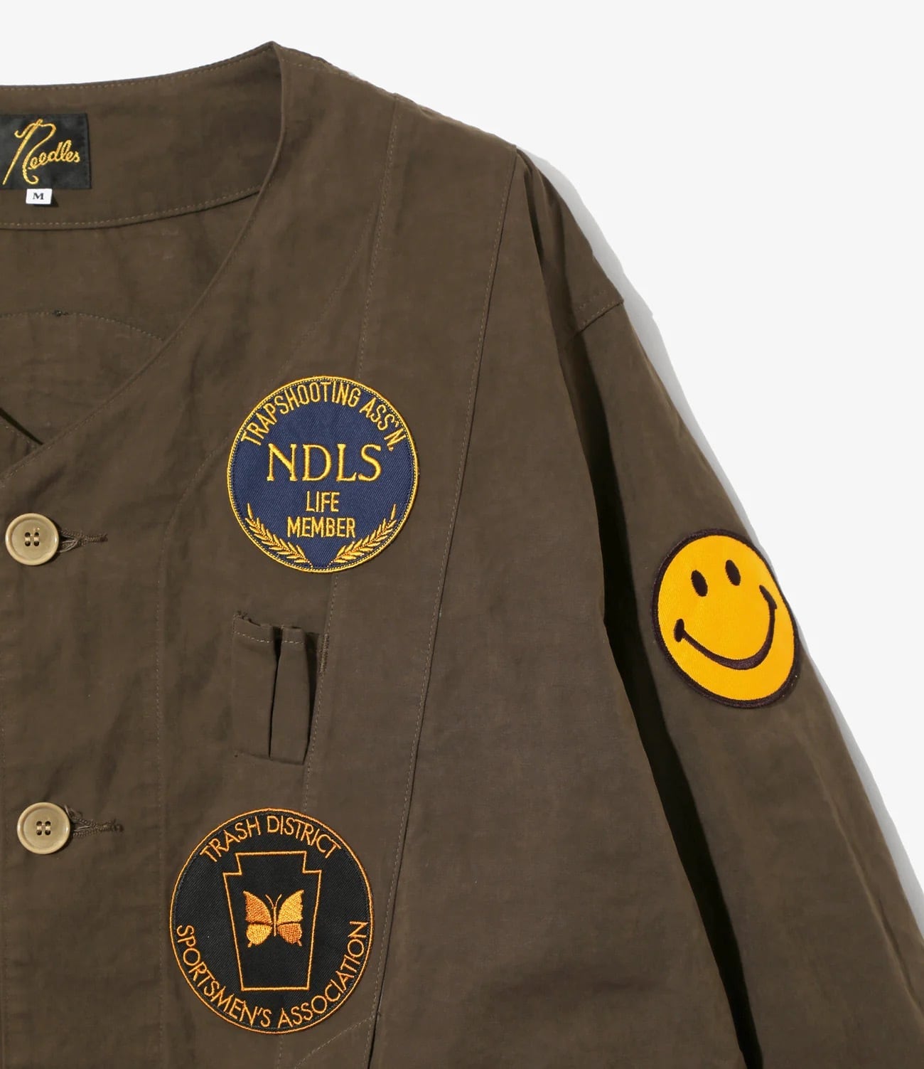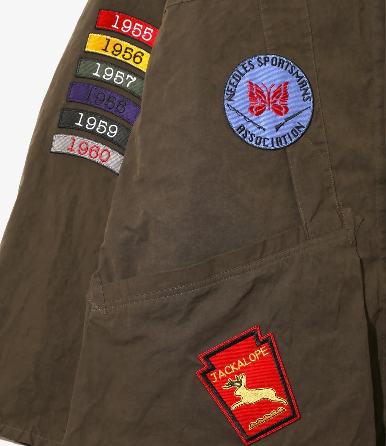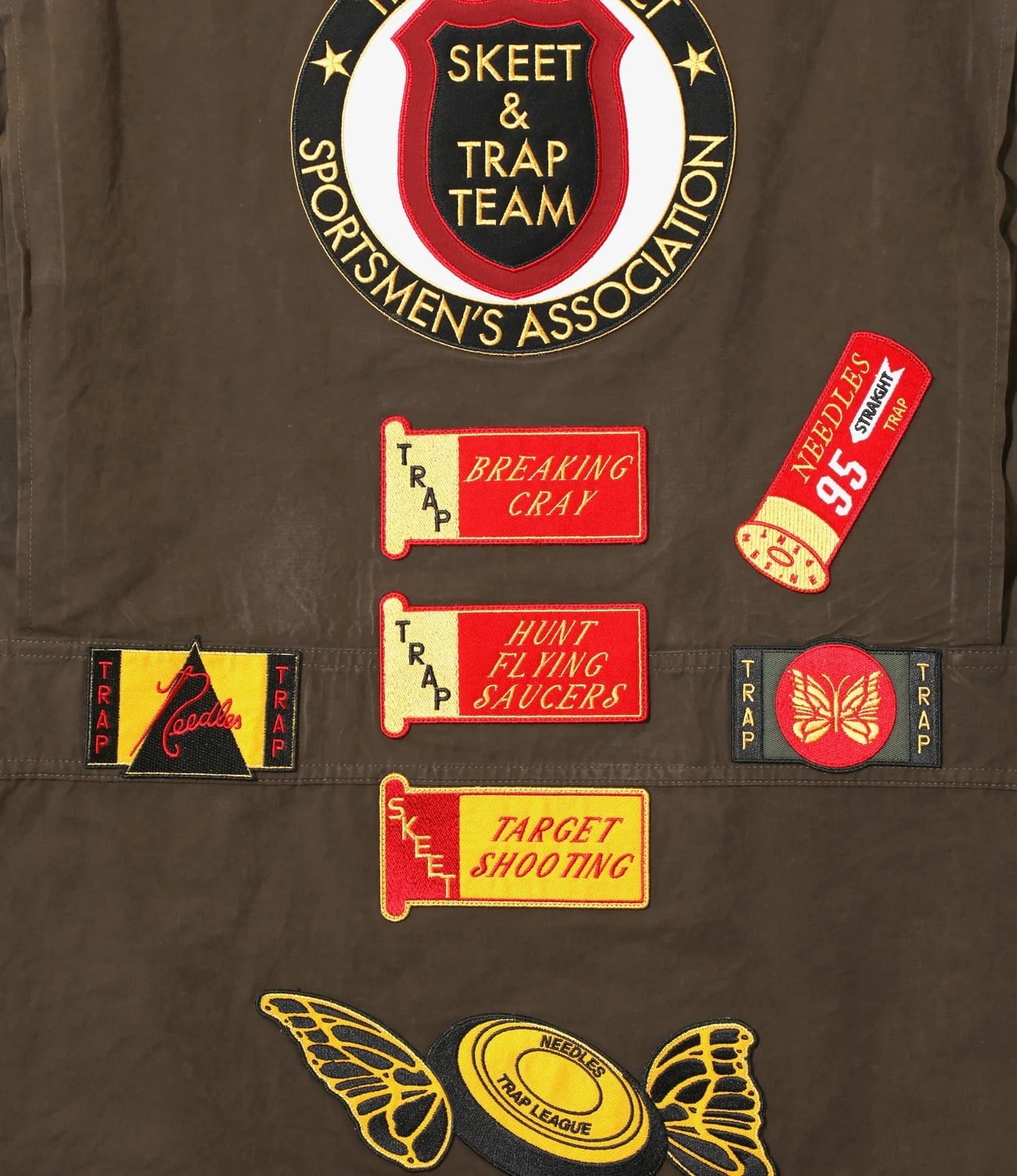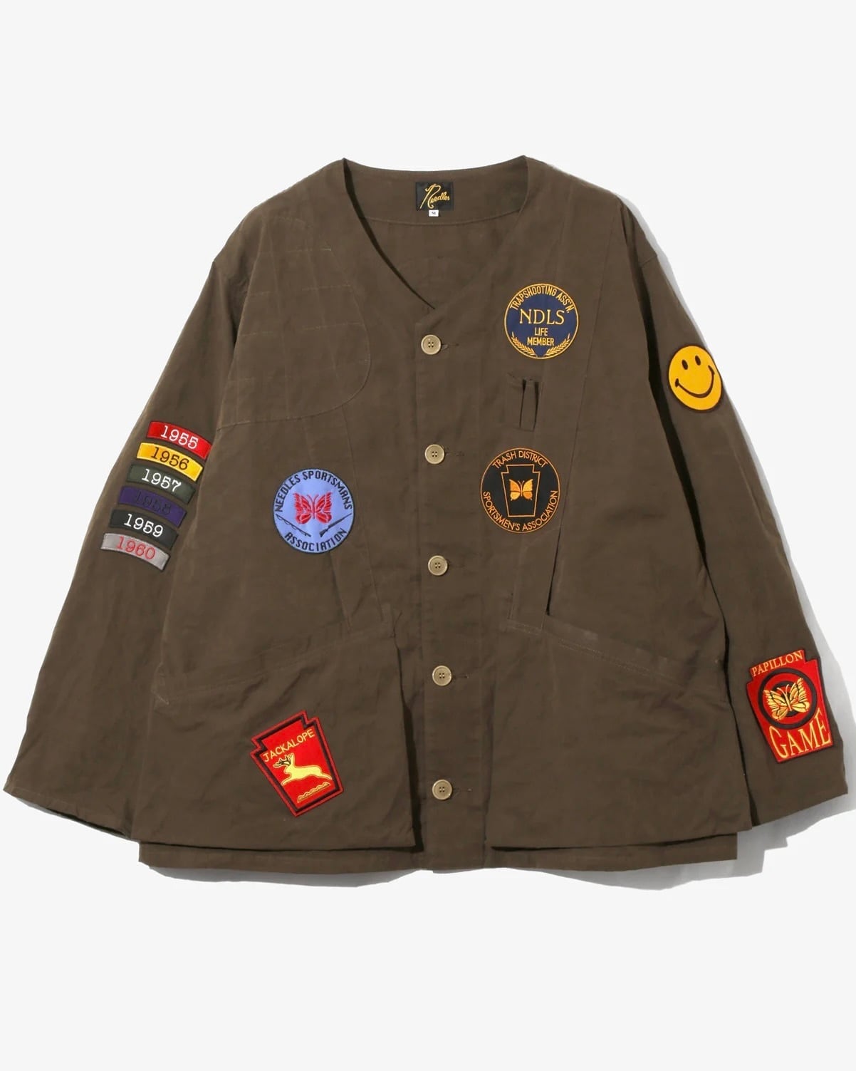 〈NEEDLES〉ならではのアレンジを加えたノーカラーのシューティングジャケットが登場。ガンパッチやショルダーパッド、ゲームポケットなどオーセンティックなディテールを備えつつ、フロントとバックに配された多数のオリジナルワッペンが存在感を放ちます。生地にはヴィンテージのような雰囲気漂うワックスド加工のコットンを使用し、撥水性と耐久性を両立。使い込むほどに増す風合いも魅力的な一品です。