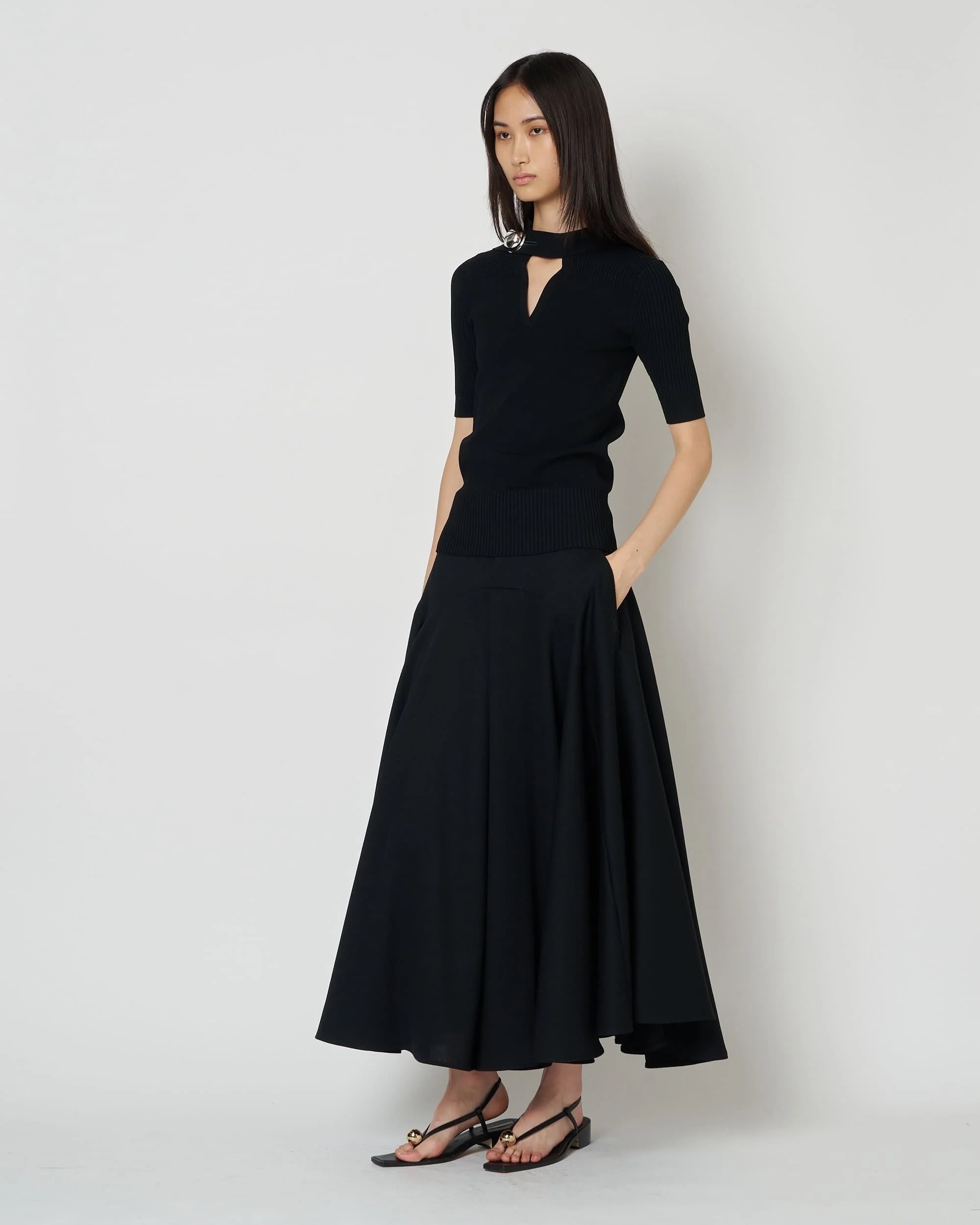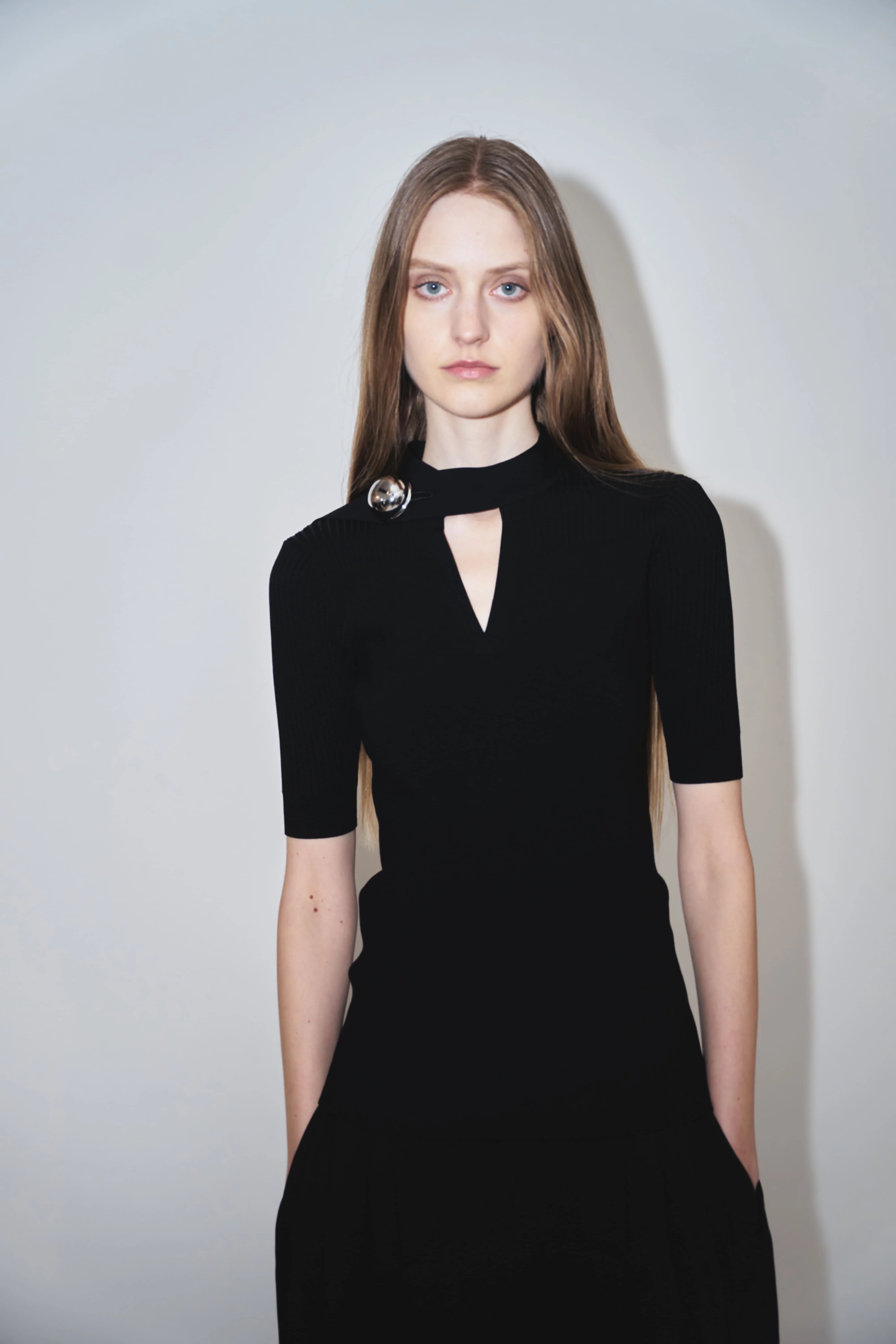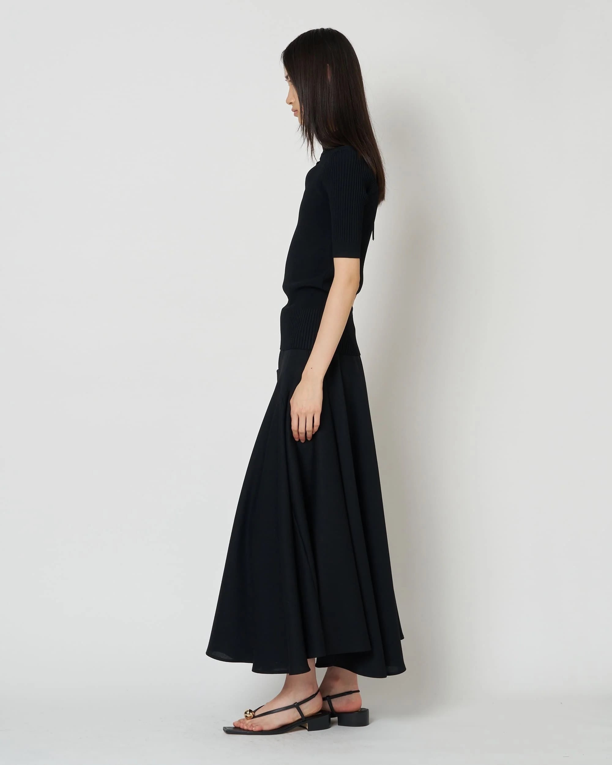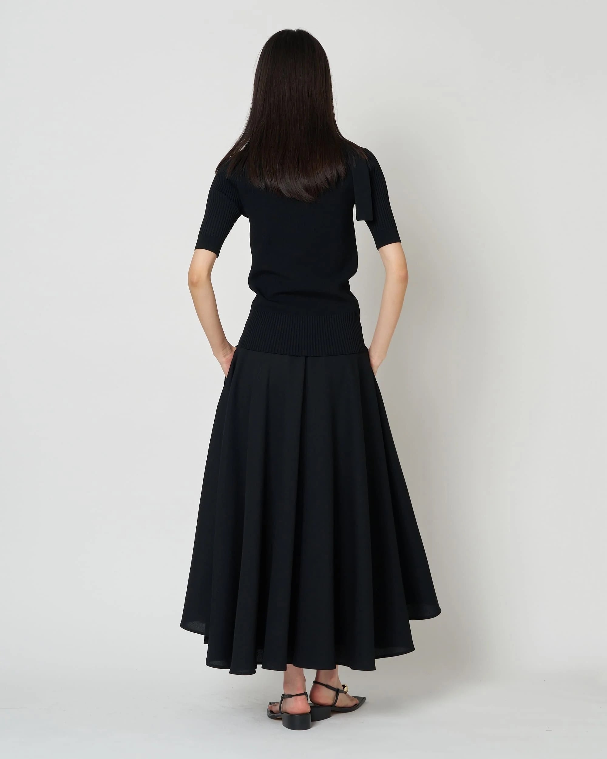 レーヨン83%、ポリエステル17%の混紡素材は、ほどよい肉感としなやかな伸縮性を備え、身体に寄り添うようなタイトなシルエットを描き出します。 リブの切り替えが生む陰影と立体感が、女性らしいフォルムを静かに引き立て、ミニマルな中に奥行きのある表情をもたらします。