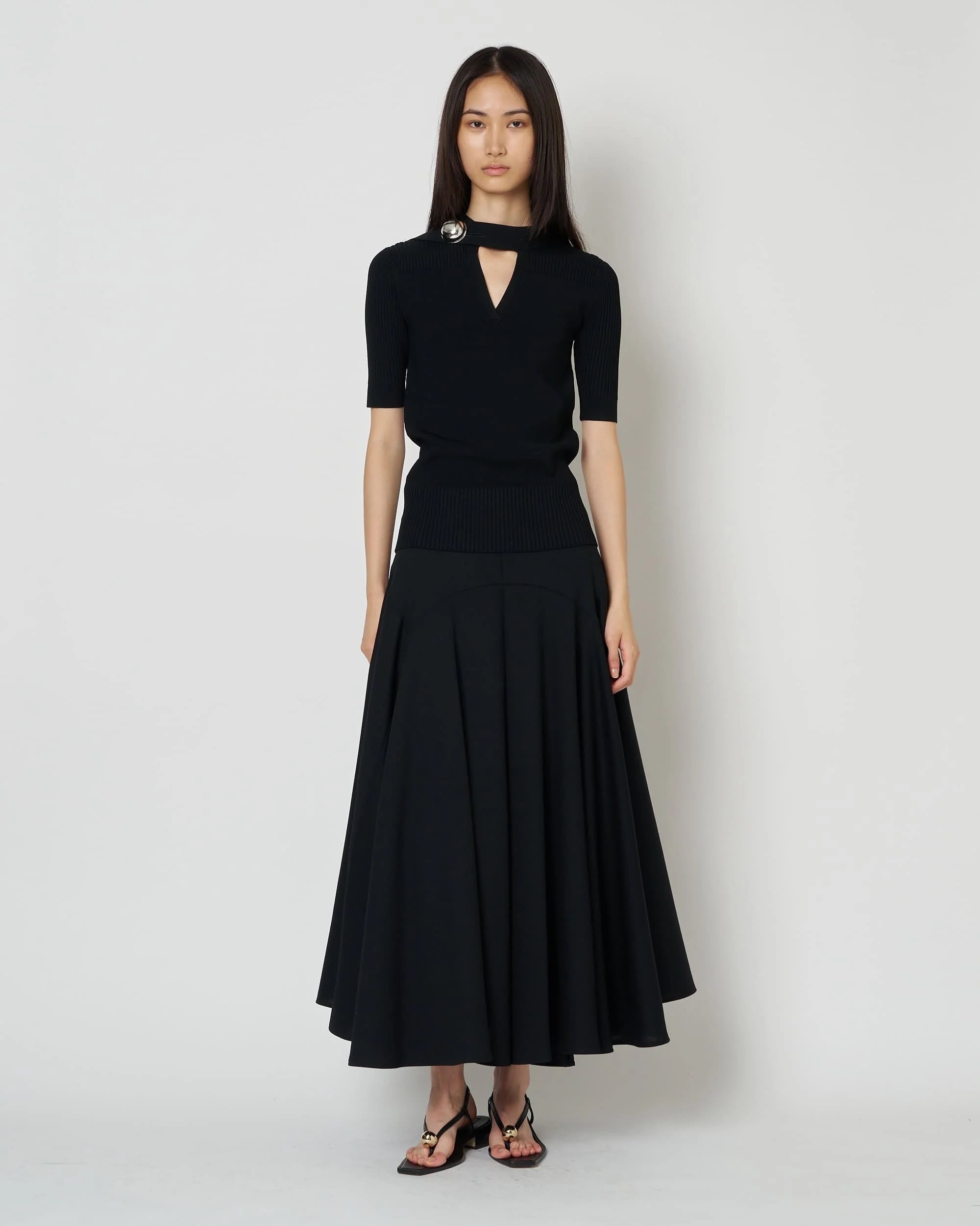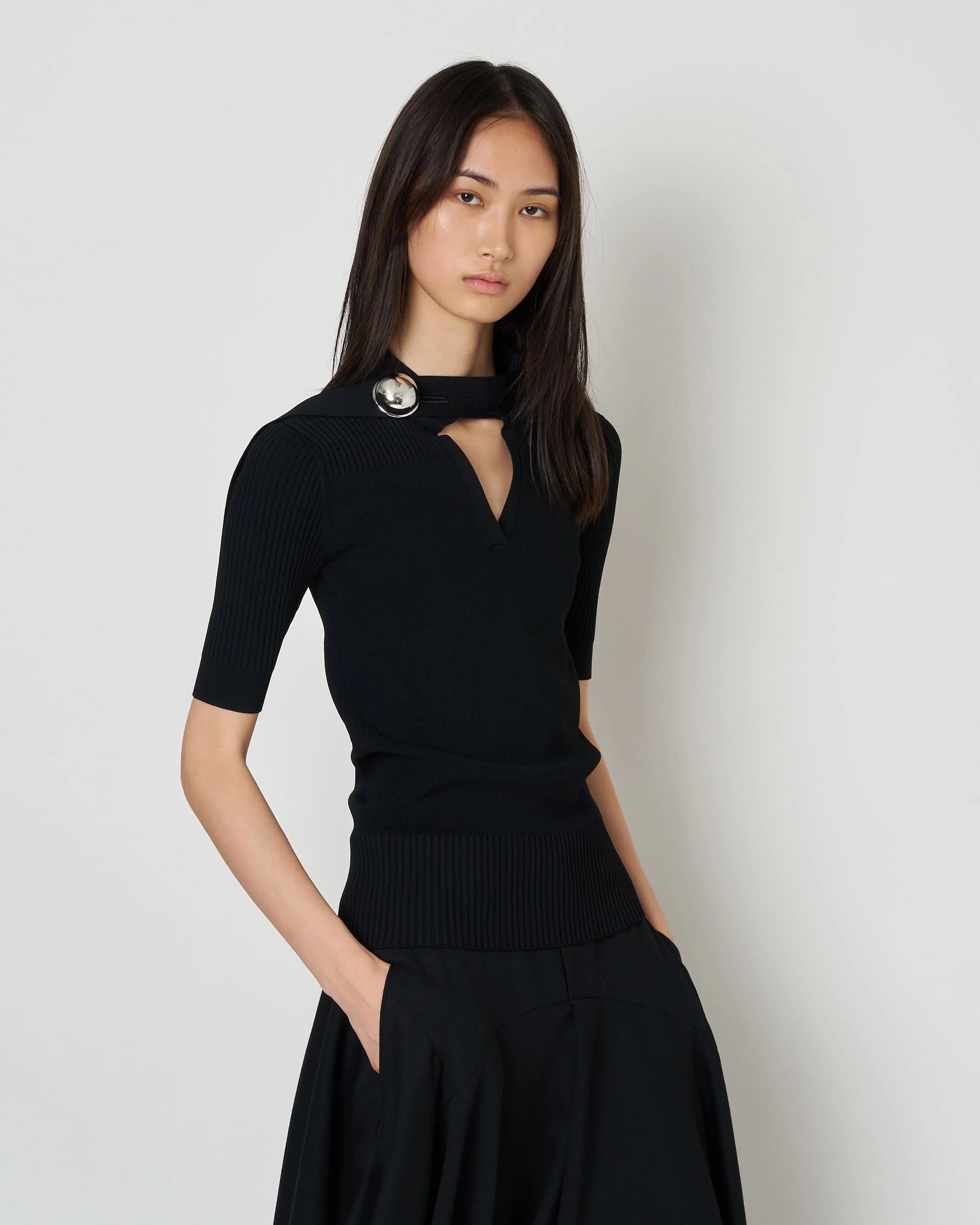 首元には、ブランドを象徴するアイコニックなボタンを配置。 控えめながらも印象的なアクセントとなり、洗練された佇まいにさりげない緊張感を添えます。 一枚での着用はもちろん、ジャケットやシャツのインナーとしても活躍し、シーズンを問わずスタイリングに取り入れやすい一着。