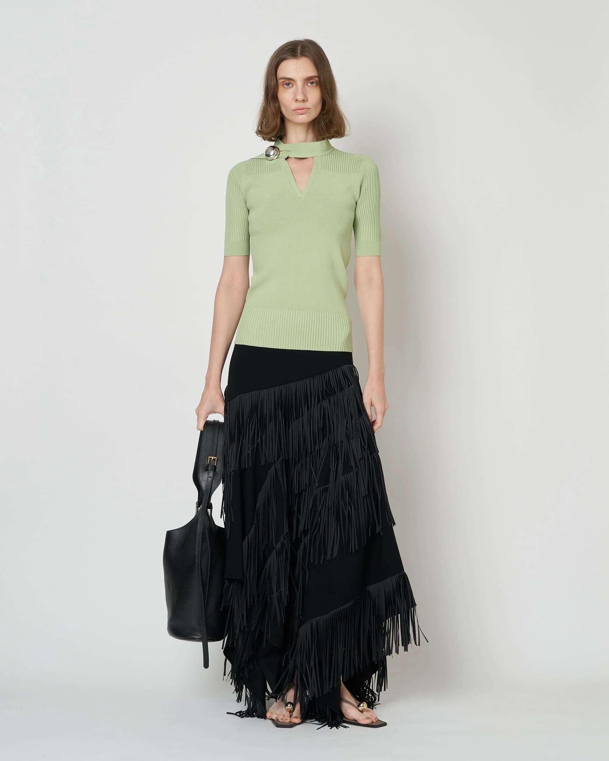 首元には、ブランドを象徴するアイコニックなボタンを配置。 控えめながらも印象的なアクセントとなり、洗練された佇まいにさりげない緊張感を添えます。 一枚での着用はもちろん、ジャケットやシャツのインナーとしても活躍し、シーズンを問わずスタイリングに取り入れやすい一着。