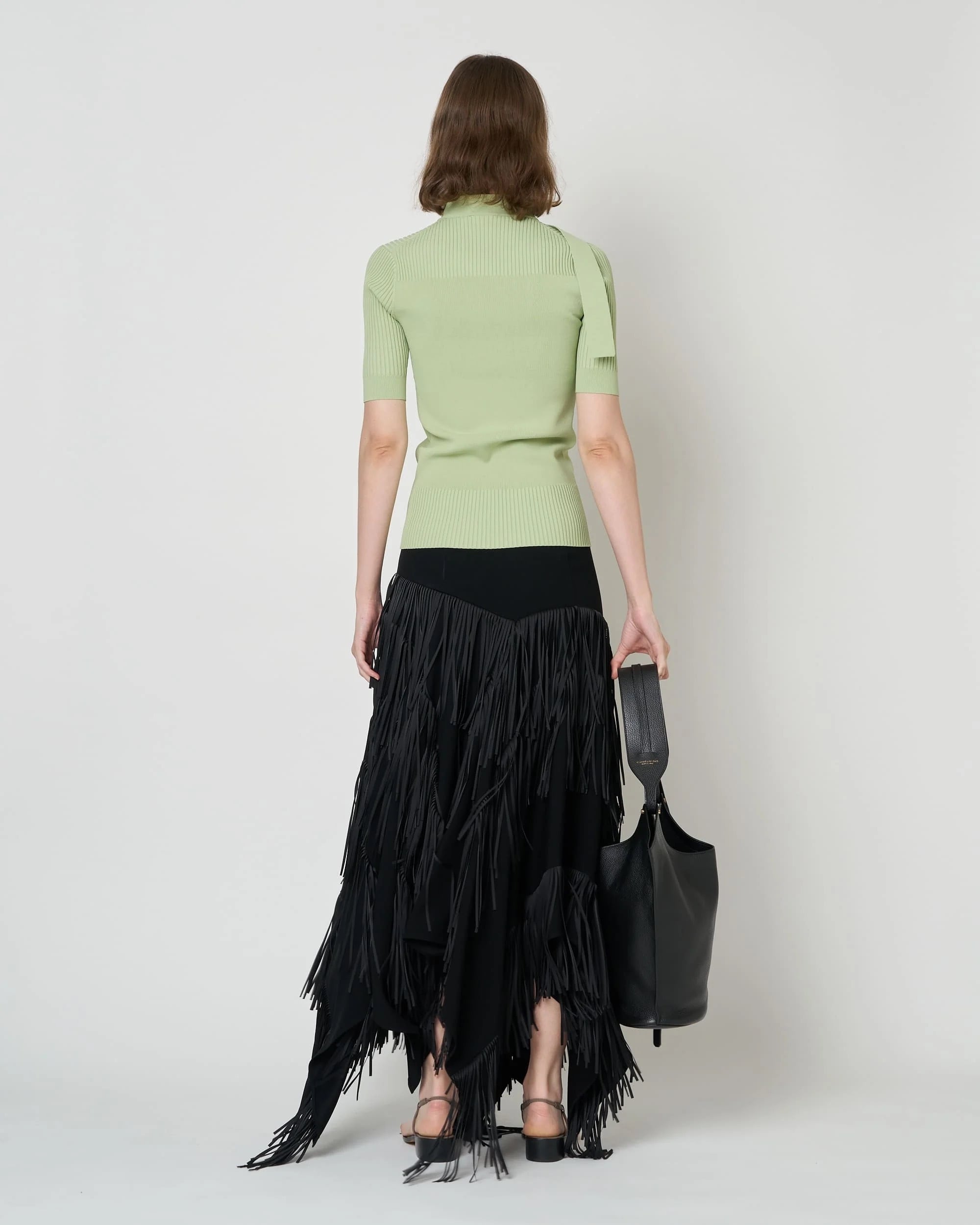 レーヨン83%、ポリエステル17%の混紡素材は、ほどよい肉感としなやかな伸縮性を備え、身体に寄り添うようなタイトなシルエットを描き出します。 リブの切り替えが生む陰影と立体感が、女性らしいフォルムを静かに引き立て、ミニマルな中に奥行きのある表情をもたらします。