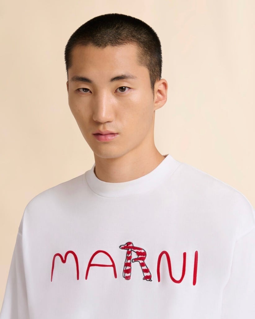 コットンジャージー製半袖Tシャツ。 クルーネックのリラックスフィット。 胸元にフロックプリントのMarniロゴを配し、「Marni Animal Alphabet」のふわふわした「M」の文字をあしらっています。