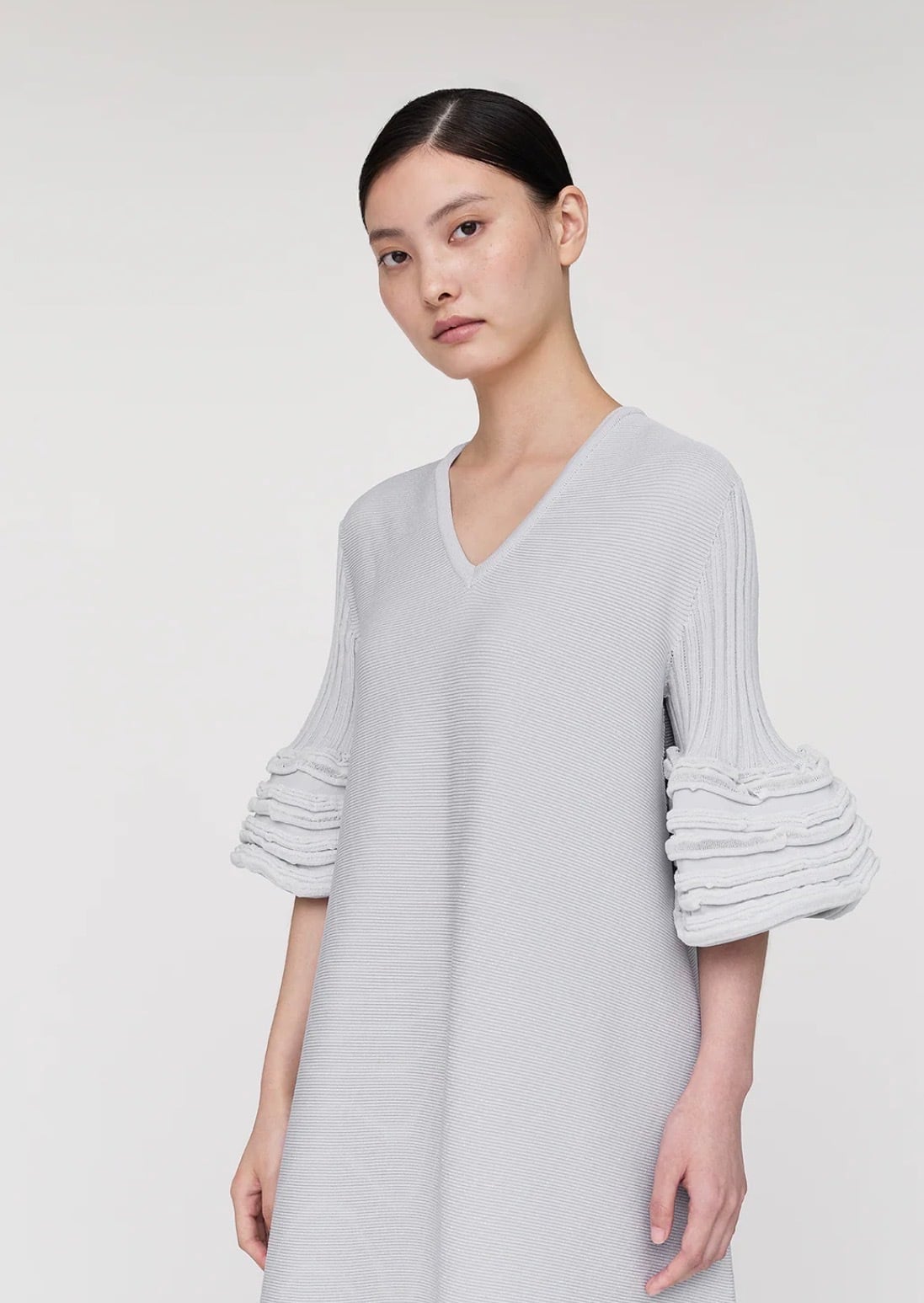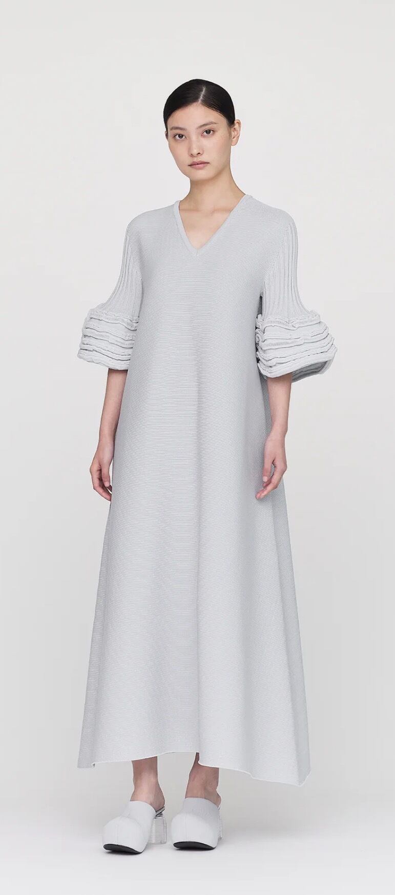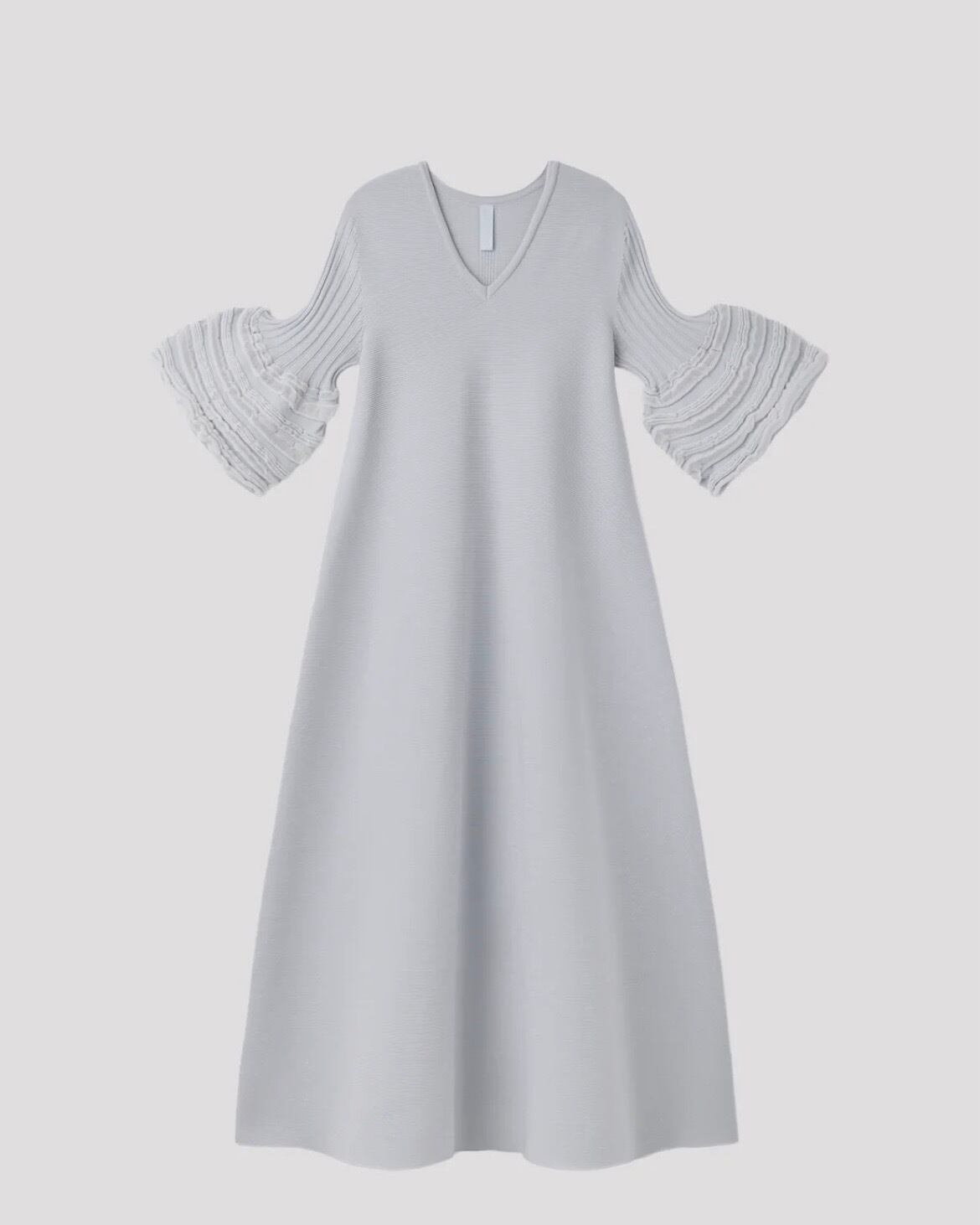 CFCLを象徴するPOTTERYシリーズのベルスリーブフレアドレス。 弾力性に富み、リズミカルに揺れ動くベルスリーブや洗練された印象のVネックは、あらゆるオケージョンに対応できるデザインです。ボディラインを拾わないフレアのシルエットで、縫代がなく、ストレッチ性に優れ、快適な着心地です。