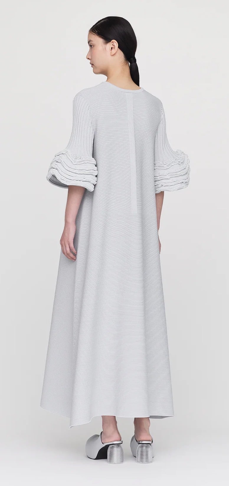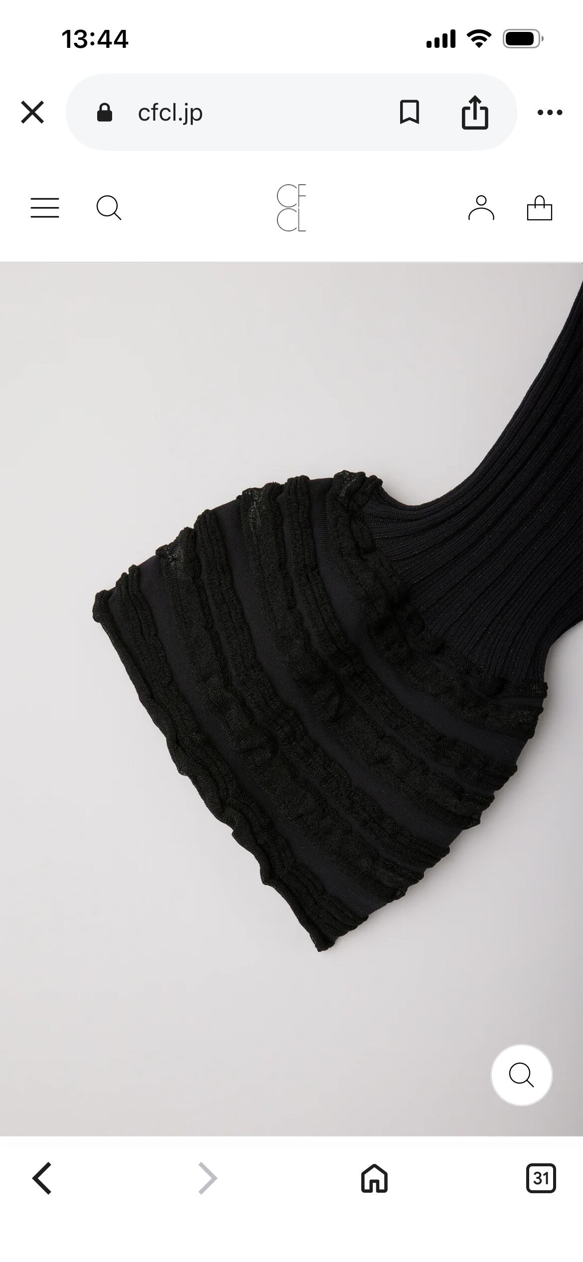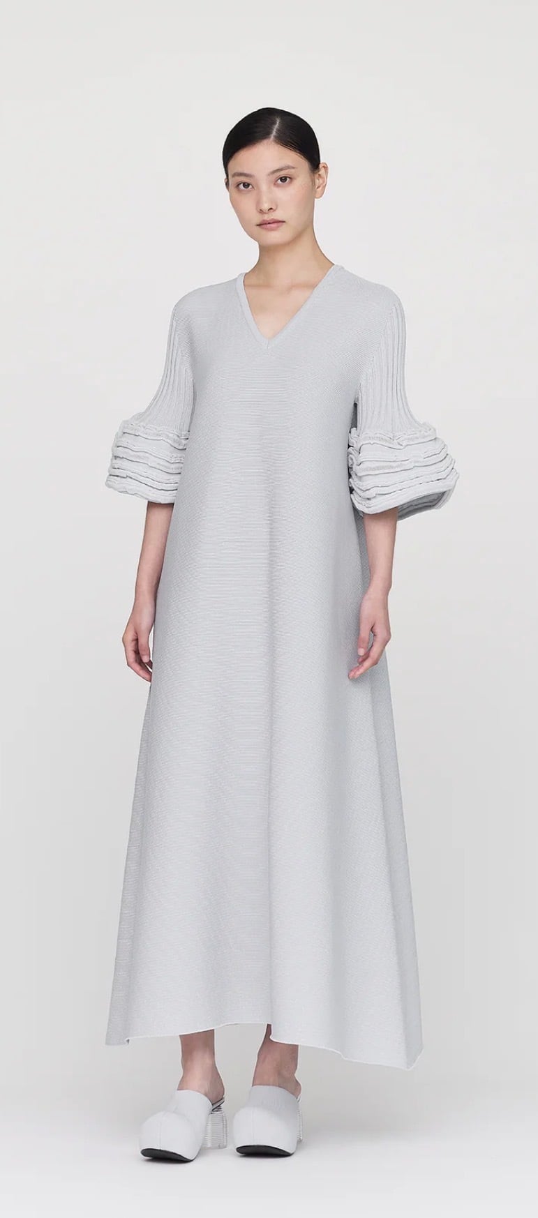 CFCLを象徴するPOTTERYシリーズのベルスリーブフレアドレス。 弾力性に富み、リズミカルに揺れ動くベルスリーブや洗練された印象のVネックは、あらゆるオケージョンに対応できるデザインです。ボディラインを拾わないフレアのシルエットで、縫代がなく、ストレッチ性に優れ、快適な着心地です。