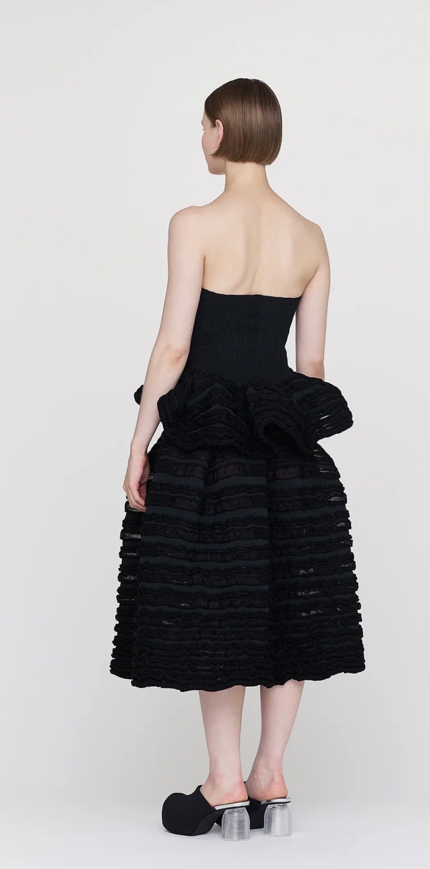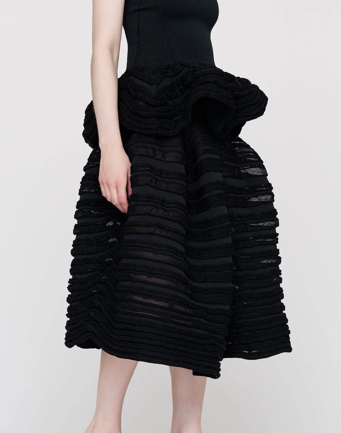 CFCLを象徴するPOTTERYシリーズのスカート。ボリューミーなシルエットと、複雑な凹凸と奥行きのある透明感を表現したユニークな編み地が印象的です。弾力性に富み、歩くたびにリズミカルに揺れ動きます。縫代がなく、快適な着心地です。