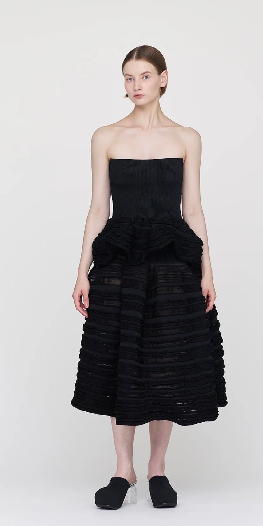 CFCLを象徴するPOTTERYシリーズのスカート。ボリューミーなシルエットと、複雑な凹凸と奥行きのある透明感を表現したユニークな編み地が印象的です。弾力性に富み、歩くたびにリズミカルに揺れ動きます。縫代がなく、快適な着心地です。