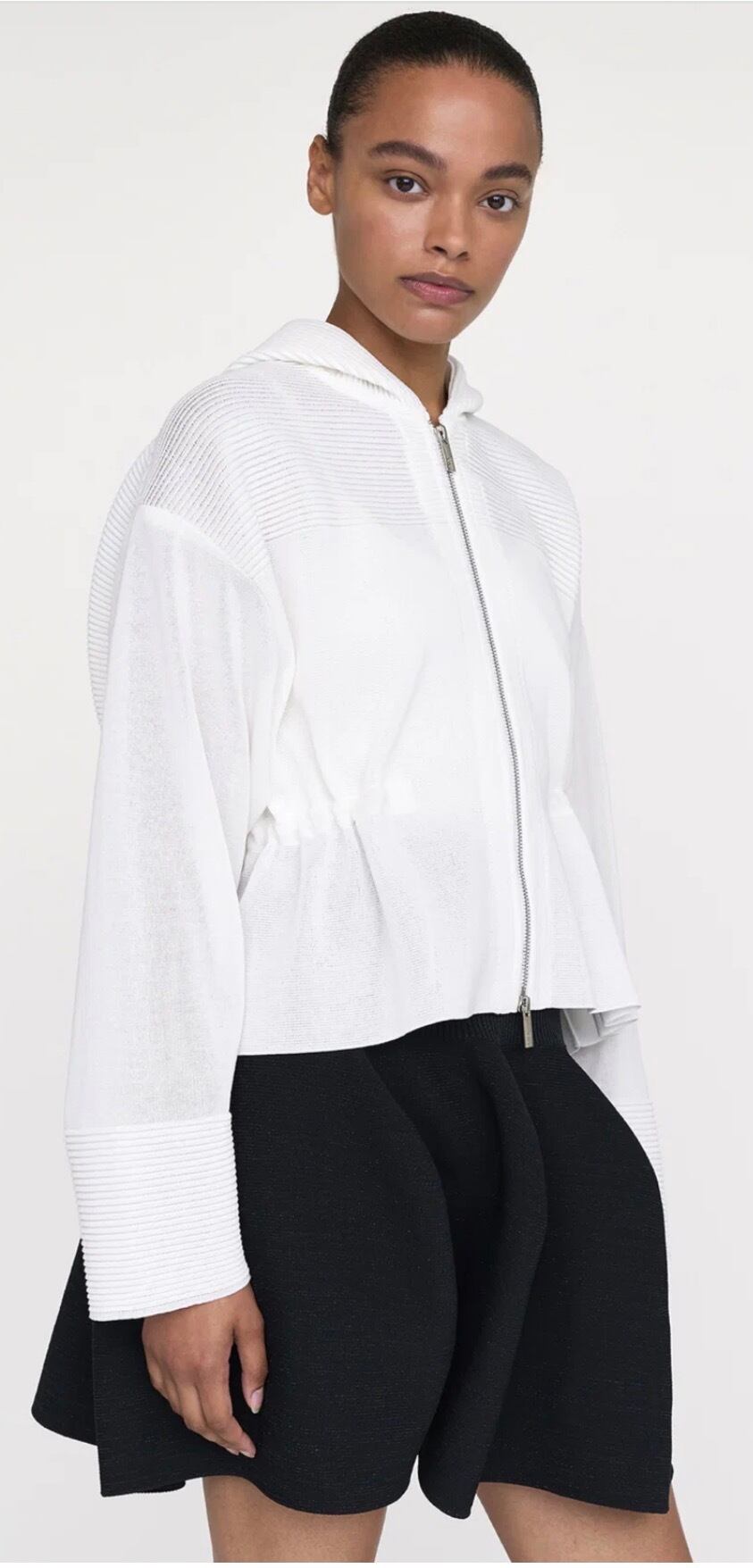 ソリッドな印象のフーディジャケット。切り替えやステッチのディテールをミニマルに抑えながら、フード、肩、裾にピンタックのデザインを施しています。ウエストのドローストリングでシルエットを調整できるため、スタイルをアレンジしてご着用いただけます。
