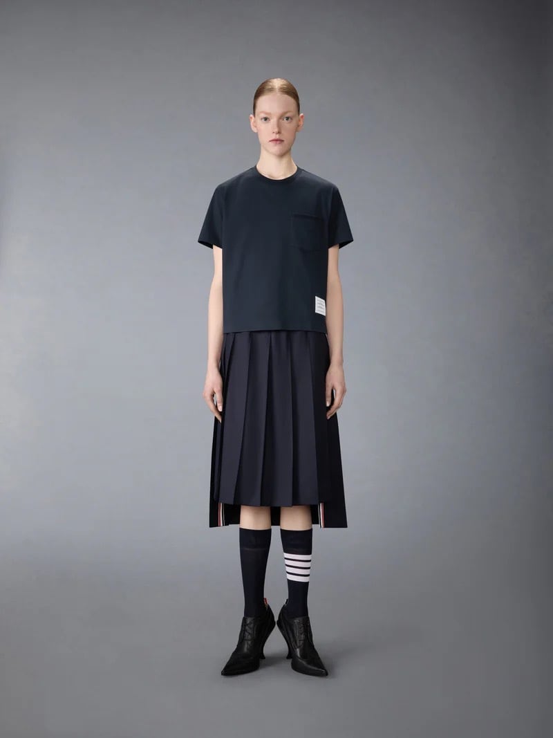 裾、両サイドのスリット、襟に控えめなトム ブラウンのエンブレムをあしらった通気性のよいコットンシャツは、「クワイエット・ラグジュアリー」(Quiet Luxury) の典型です。カジュアルな毎日の定番で、シンプルなスラックスやプリーツスカートを格上げしましょう。