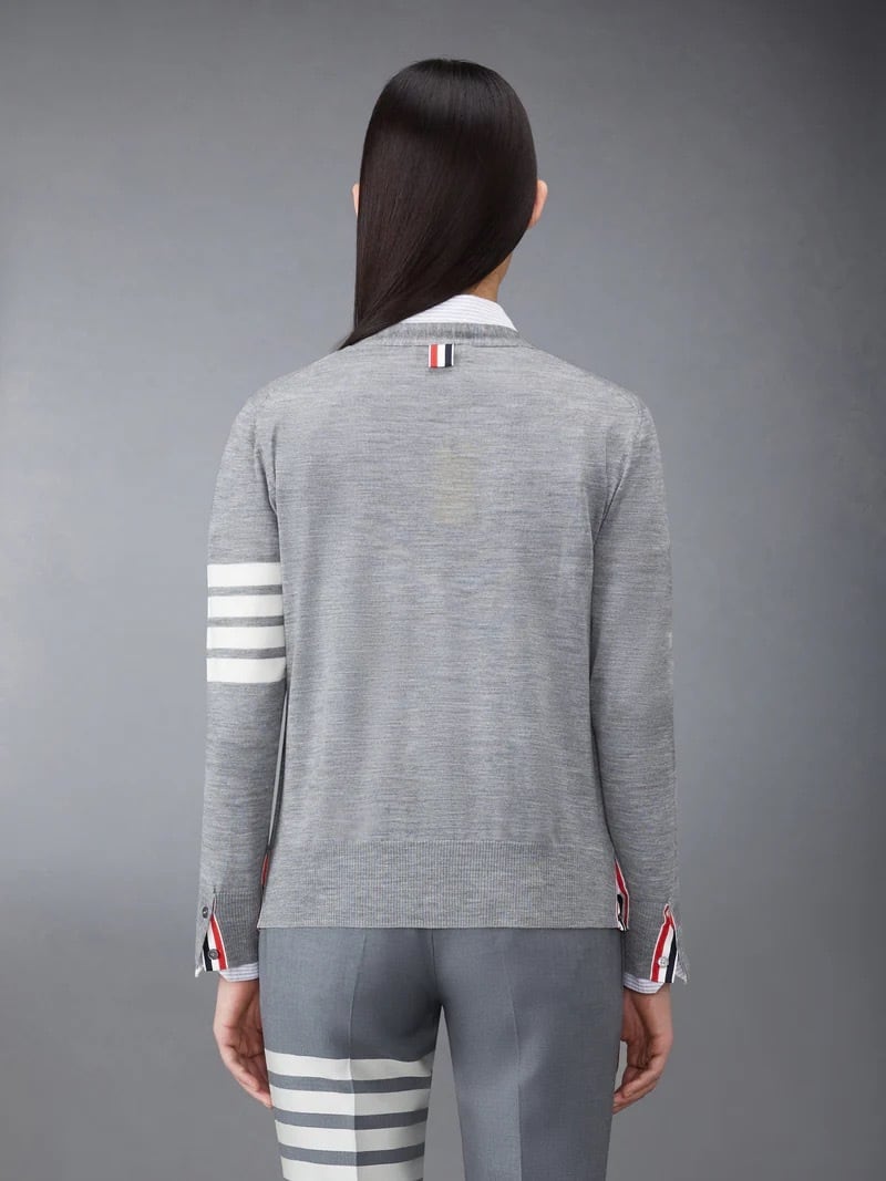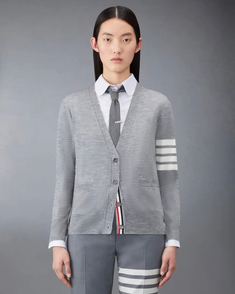 Thom Browneのシグネチャーである2つブランドアイコン、グログランのトリミングと4BARストライプがあしらわれたウールのVネックカーディガンです。洗練さを醸し出す、最高級バージンウールのゆったりとしたカーディガンです。