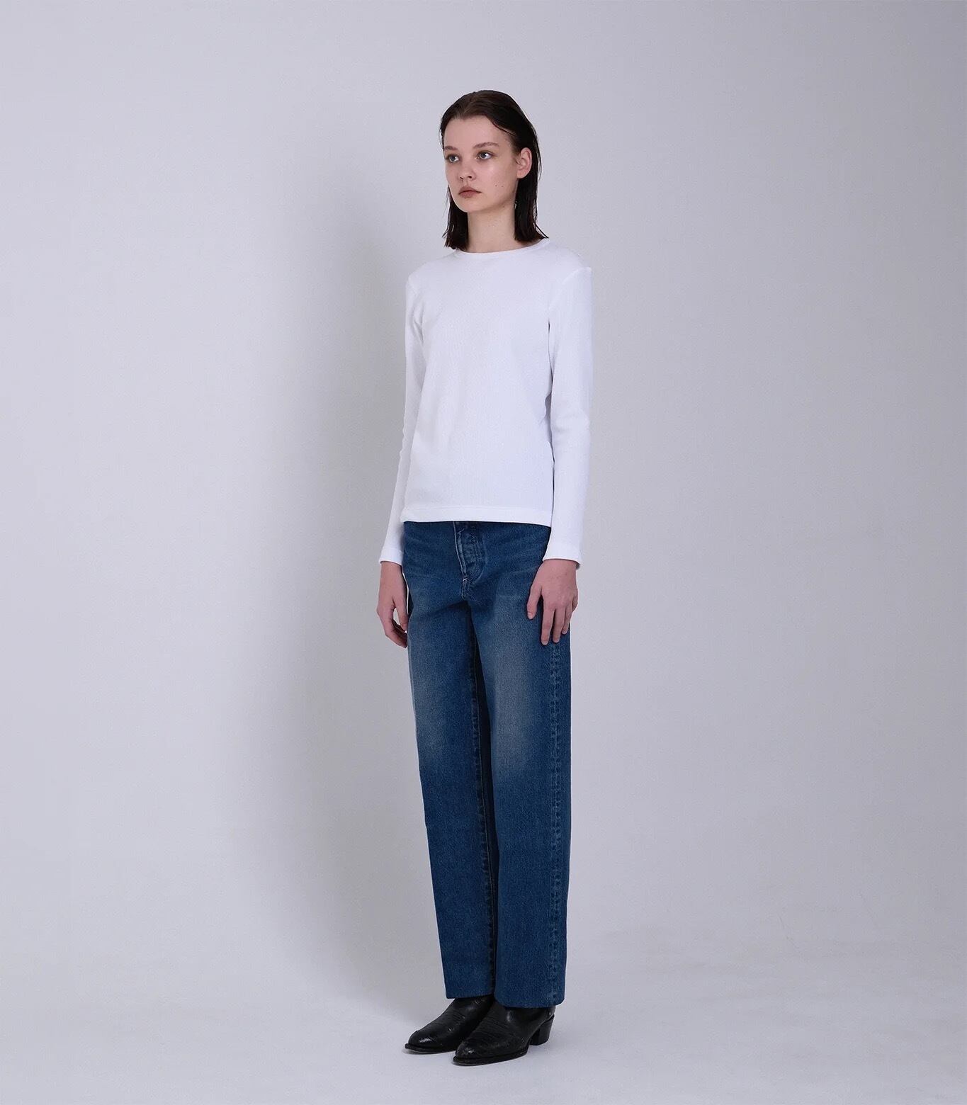 日本製プレミアムセルビッジデニムを使用し、ワイドレッグと深めの股上でバランスの良いリラックスフィットに仕上げています。
