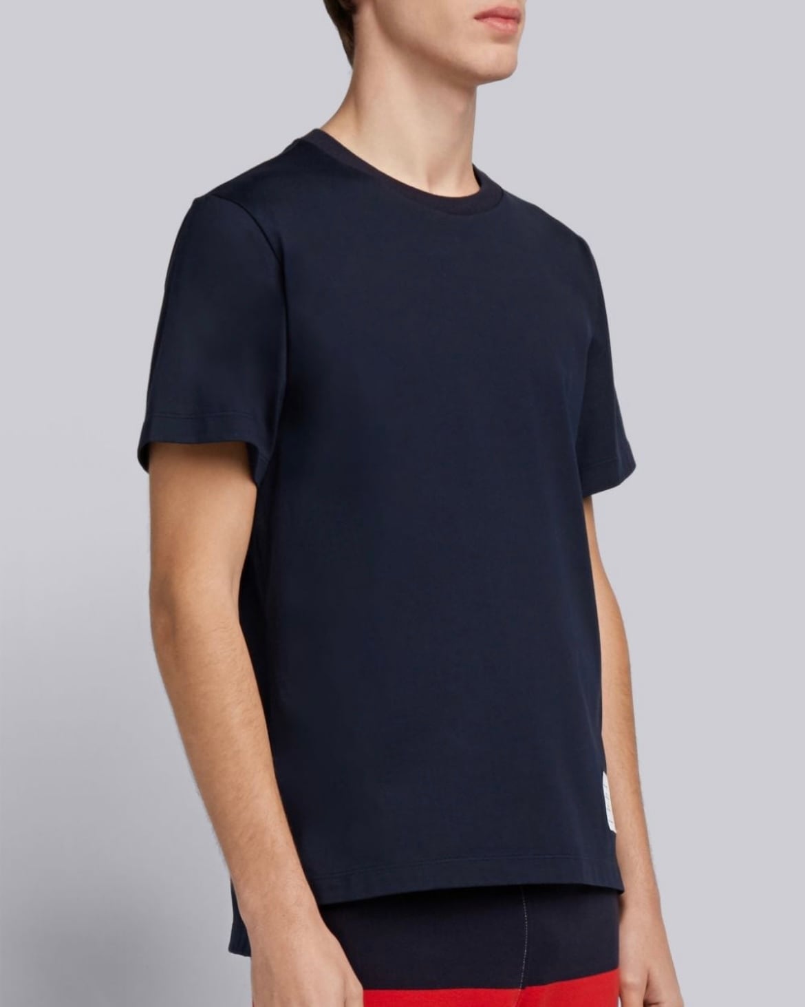 ネイビーのミディアムウェイトのコットンジャージーを使用したリラックスフィットのクルーネックTシャツ。ショートスリーブ。サイドスリット。裾上にネームタグのアップリケ。背面の首元にシグネチャーストライプのグログランループタブ付き。