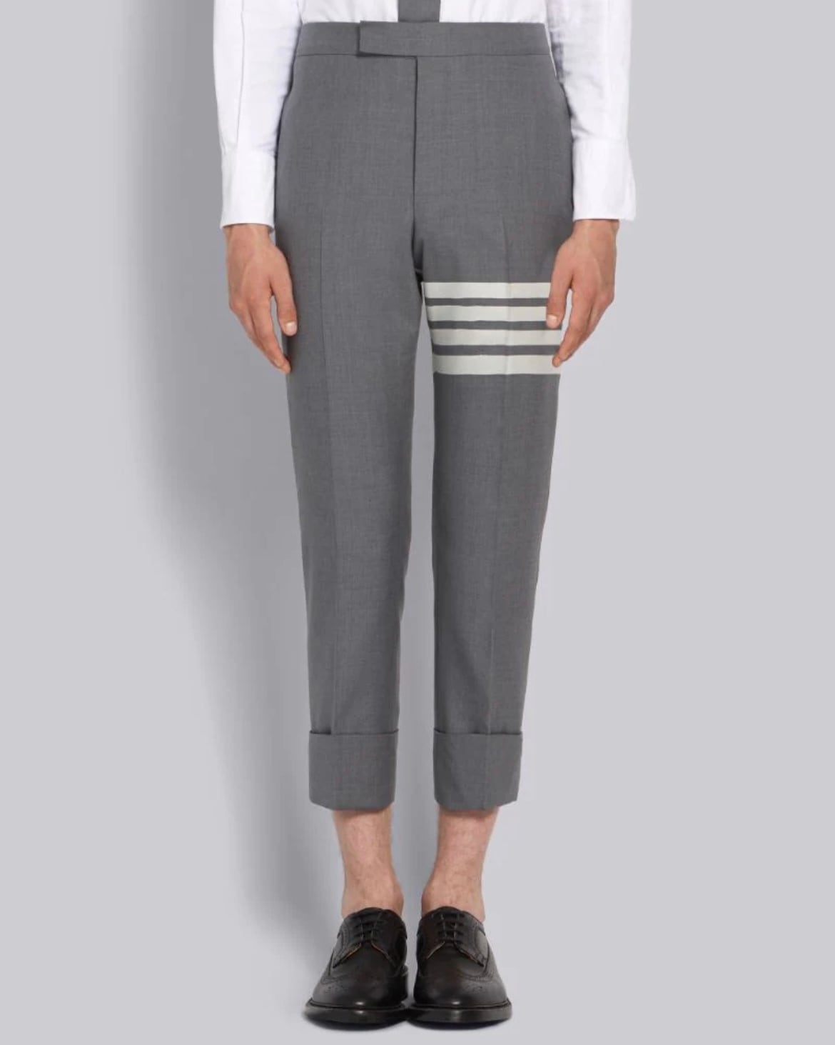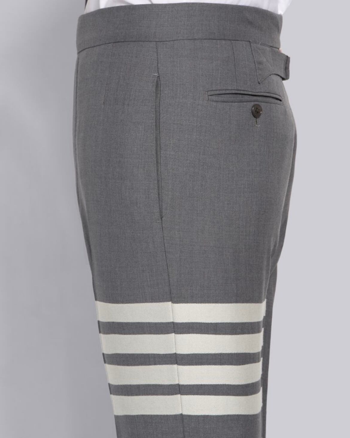 ミディアムグレー クラシックトラウザー、平織スーチング、ボタンフロント、フレンチフライ、エンジニア4BARストライプ、ジェットヒップポケット、アジャスタブルバックストラップでシグネチャーグログランループタブです。
