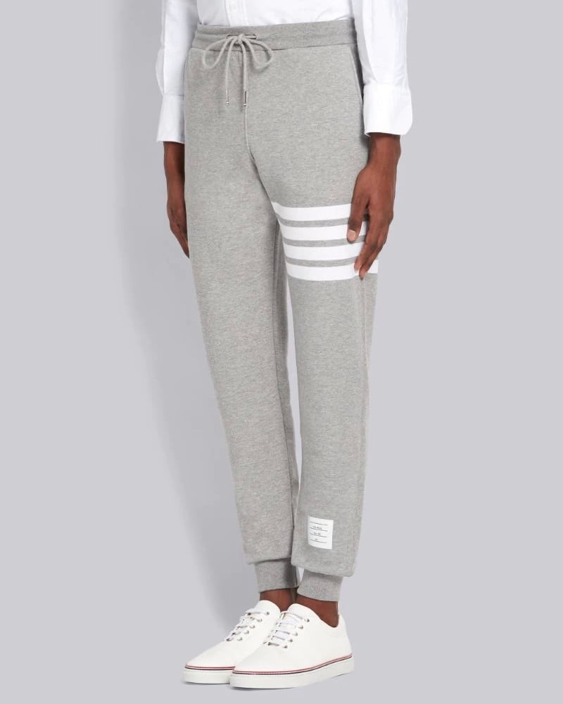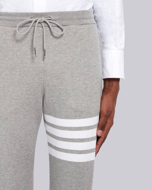 ライトグレーのコットンループバックのニット生地を使用したクラシックなスウェットパンツ。左ももにホワイトの4BARストライプがあしらわれています。シルバーのアグレット付きの調節可能なドローストリングウエスト、リブ編みのウエストバンドと裾口、ヒップポケット1つ。左裾上にネームタグアップリケ付き。バックウエストにシグネチャーストライプのグログランループタブ付き。
