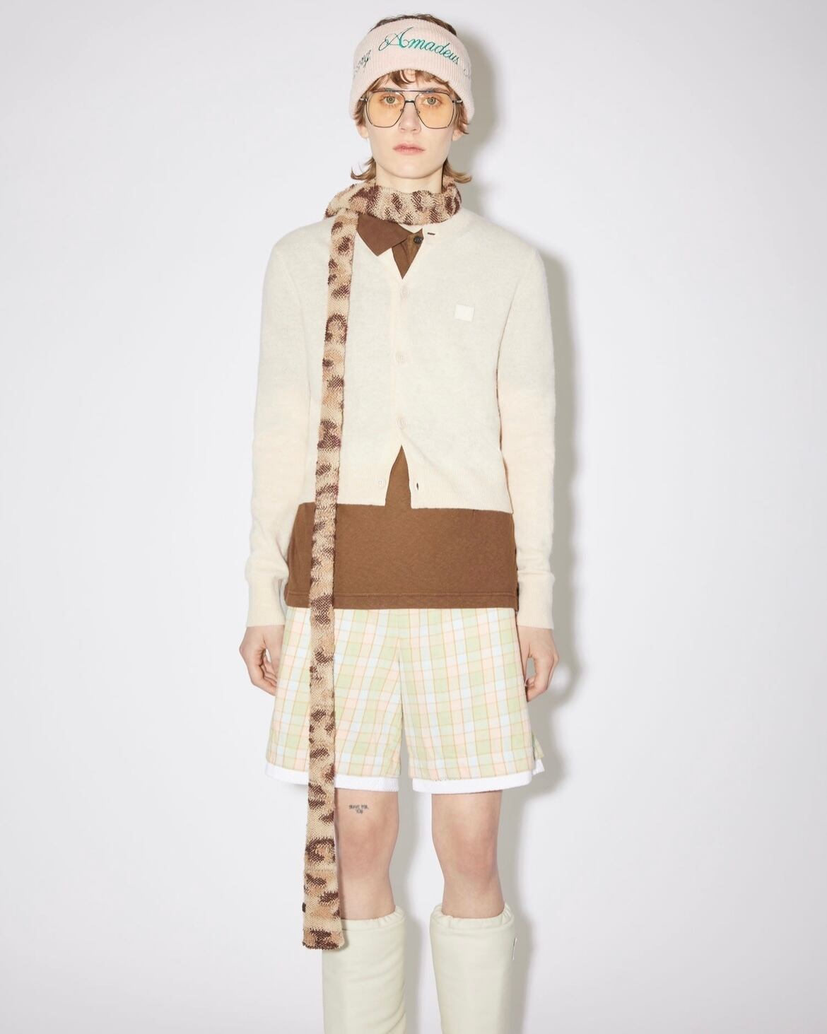 Acne Studiosのクルーネックカーディガン。ブラックの薄手ウール素材を使用。小さなフェイスパッチ付き。通常サイズのレギュラーフィットで、ややクロップドスタイル。