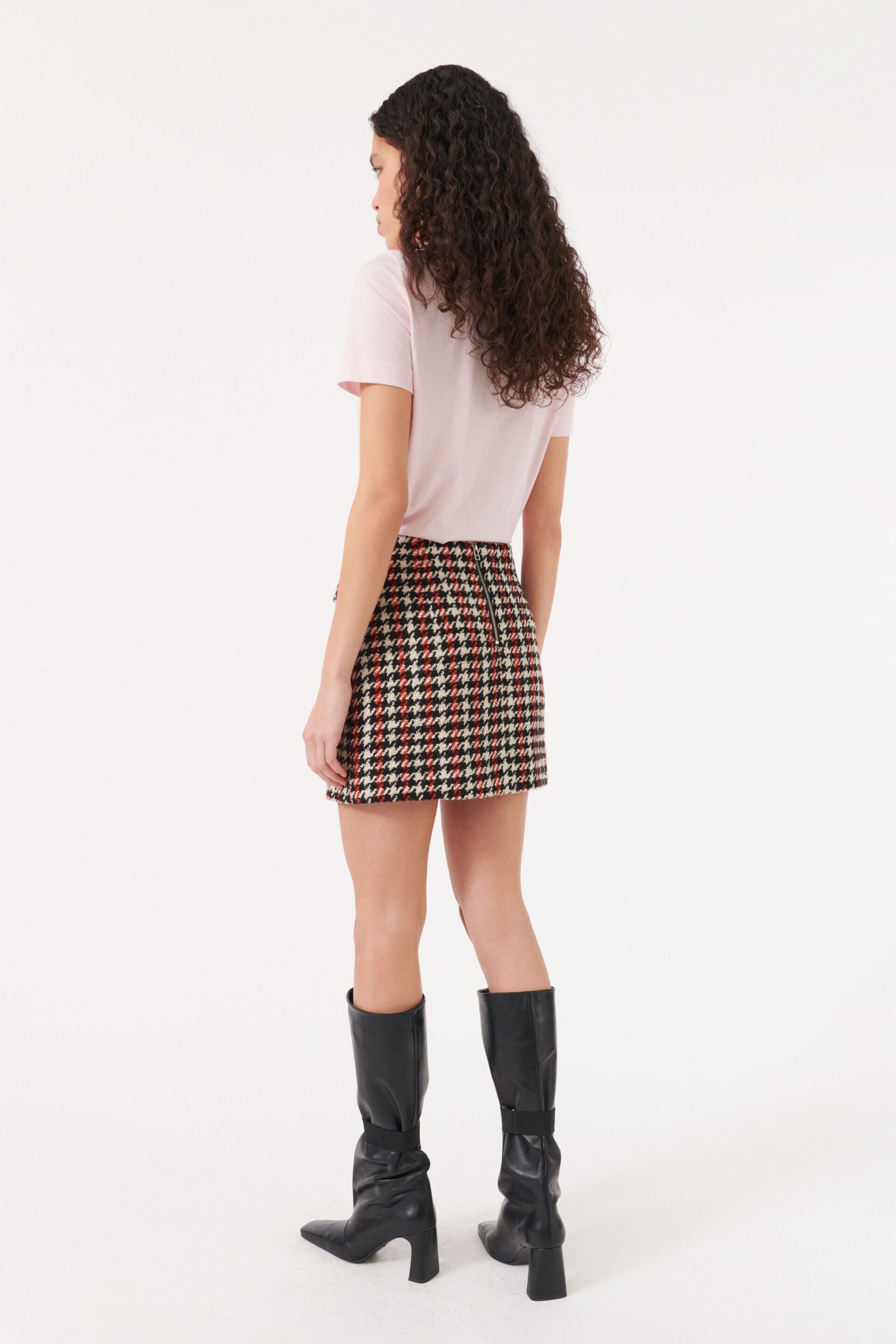 このクラシックなブークレ ミニスカートには、前面にパッチ ポケット、背面にジッパーが付いており、総裏地が付いています。