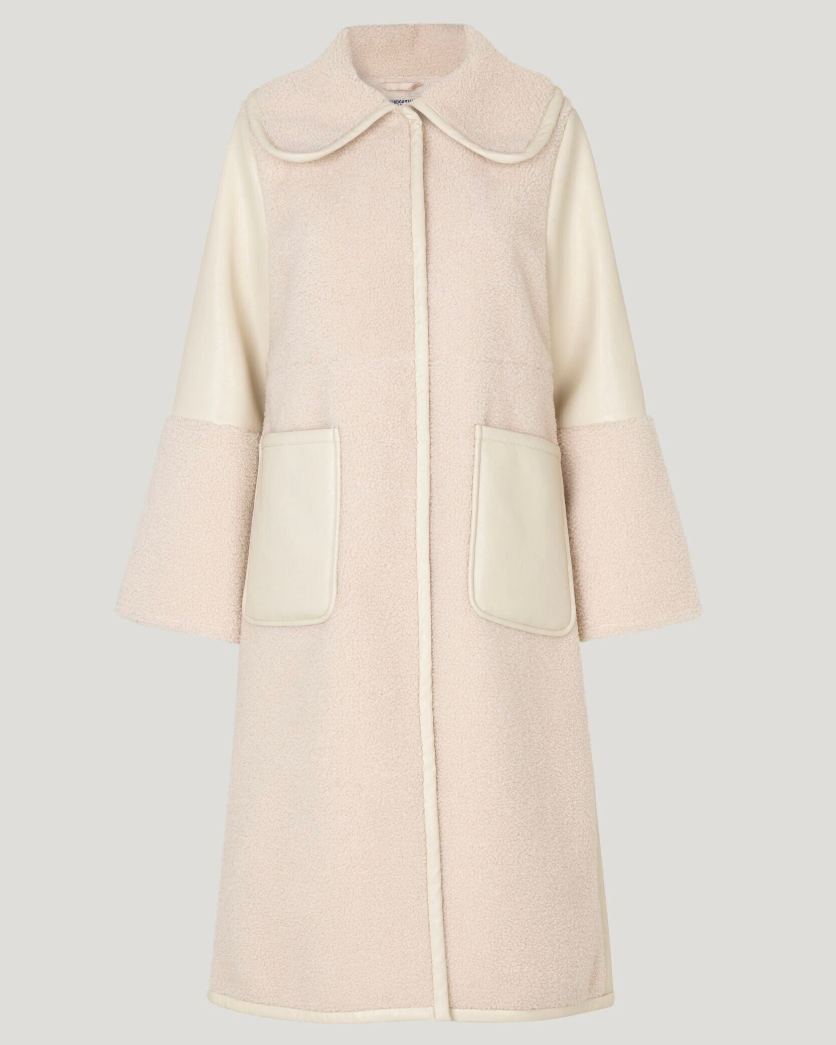 全体にシアリングのような風合いをあしらったミモレ丈のコート。フロントにはスナップボタン留めとパッチポケットがあります。コートは総裏地です。