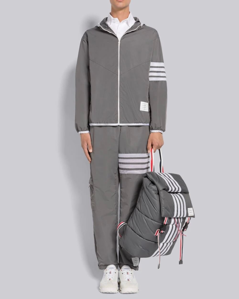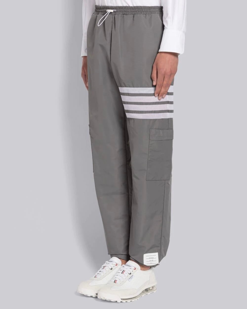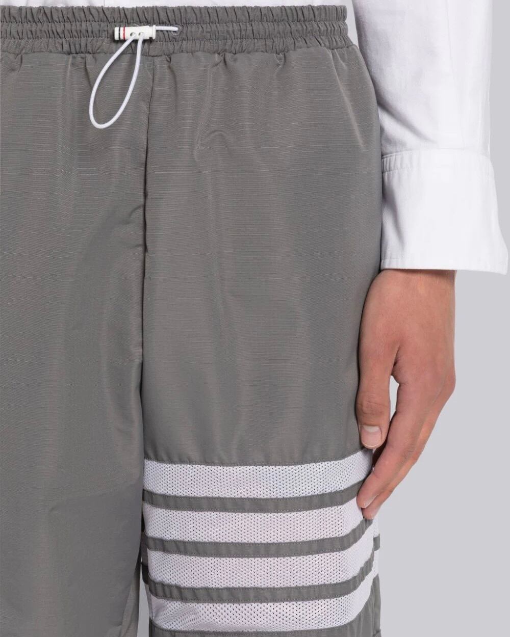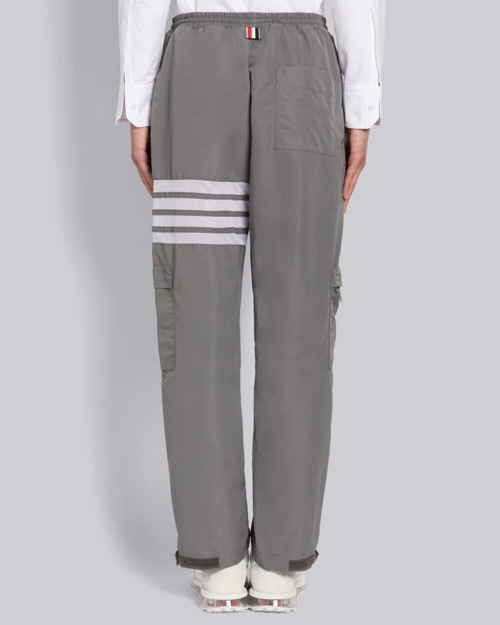 グレーのミリタリーレベルのリップストップを使用したパッカブルトラウザー。左ももにホワイトのメッシュ生地で4BARストライプがあしらわれています。ドローストリングウエスト、ホワイトのコードストッパー付き。左の裾口にネームタグのアップリケ。カーゴポケット2つ、バックにパッチポケット1つ。バックウエストにシグネチャーストライプのグログランループタブ付き。