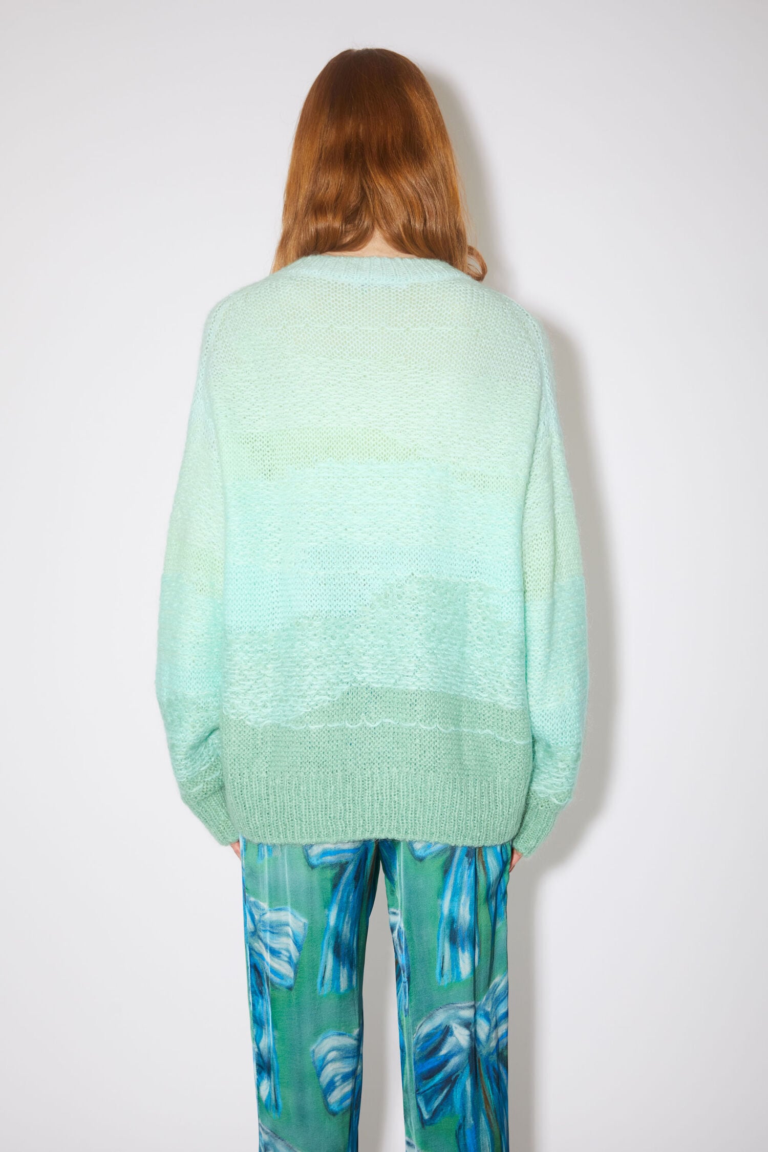 Acne Studiosのセーター。ミント/マルチの薄手のモヘアブレンド素材を使用。濃淡のあるリバースニットのディテールがポイント。Vネックのリラックスフィットスタイル。